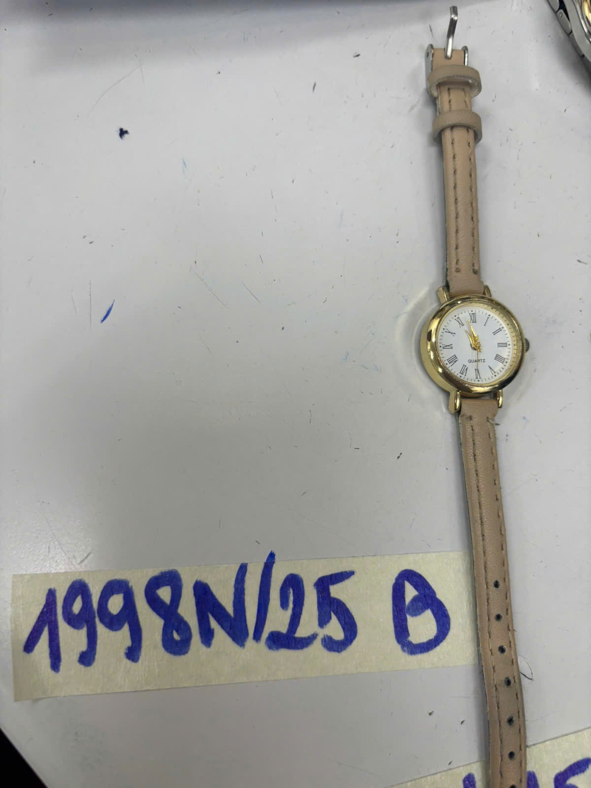 Ngày tiếp nhận: 13/11/2025 Mã hồ sơ: 1998N2025B Mô tả: 01 đồng hồ bằng kim loại hình tròn, mặt màu trắng, viền màu vàng có chữ QUARTZ, dây đeo bằng da màu be. |
