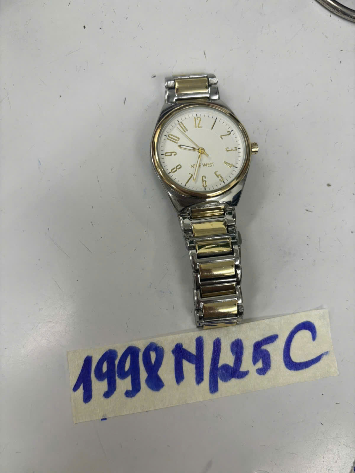 Ngày tiếp nhận: 13/11/2025 Mã hồ sơ: 1998N2025C Mô tả: 01 đồng hồ bằng kim loại hình tròn, mặt màu trắng, viền màu vàng có chữ NINE QUEST, dây đeo bằng kim loại màu vàng và trắng. |