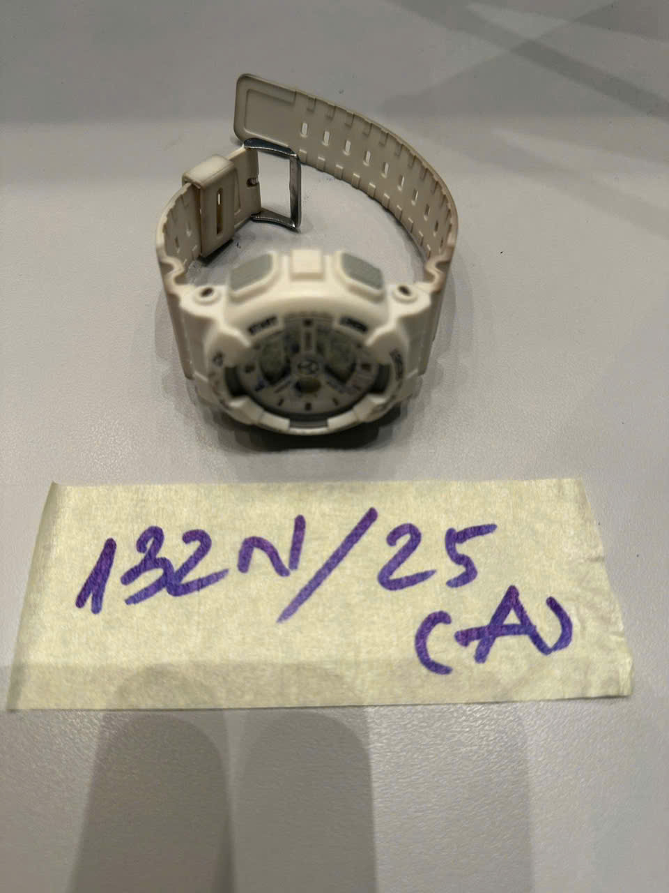 Ngày tiếp nhận: 14/12/2025 Mã hồ sơ: 132N2025A Mô tả: 01 đồng hồ màu trắng, dây cao su, mặt sau đồng hồ có khắc hình mỏ neo, đã sử dụng. |