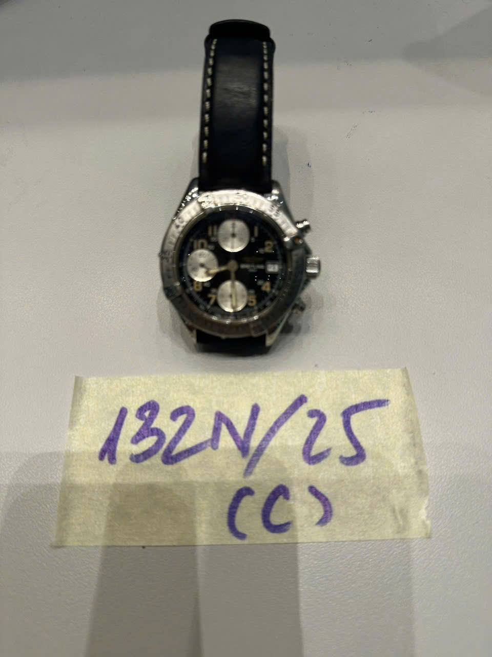Ngày tiếp nhận: 14/12/2025 Mã hồ sơ: 132N2025C Mô tả: 01 đồng hồ viền tròn, màu trắng kim loại, mặt đồng hồ màu đen, bên trên có chữ BREITLING, dây đen bằng da, đã sử dụng. |