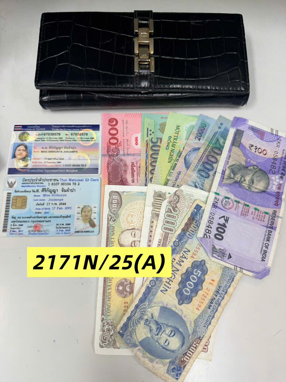 Ngày tiếp nhận: 14/12/2025 Mã hồ sơ: 2171N2025A Mô tả: 01 ví da màu đen đã sd có: 649.000vnđ, 100 bath, 100 rupee, giấy tờ tên MISS SIIKUNYA JUNJAMPA. |