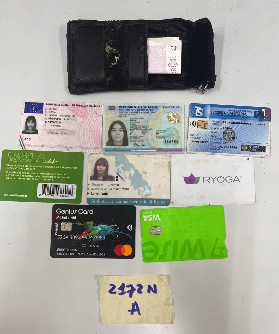 Ngày tiếp nhận: 14/12/2025 Mã hồ sơ: 2172N2025A Mô tả: 01 bóp da màu đen có: 02 thẻ nhựa tên: LERRO ILENA, 12 yuan, ngoài ra không còn gì khác. |