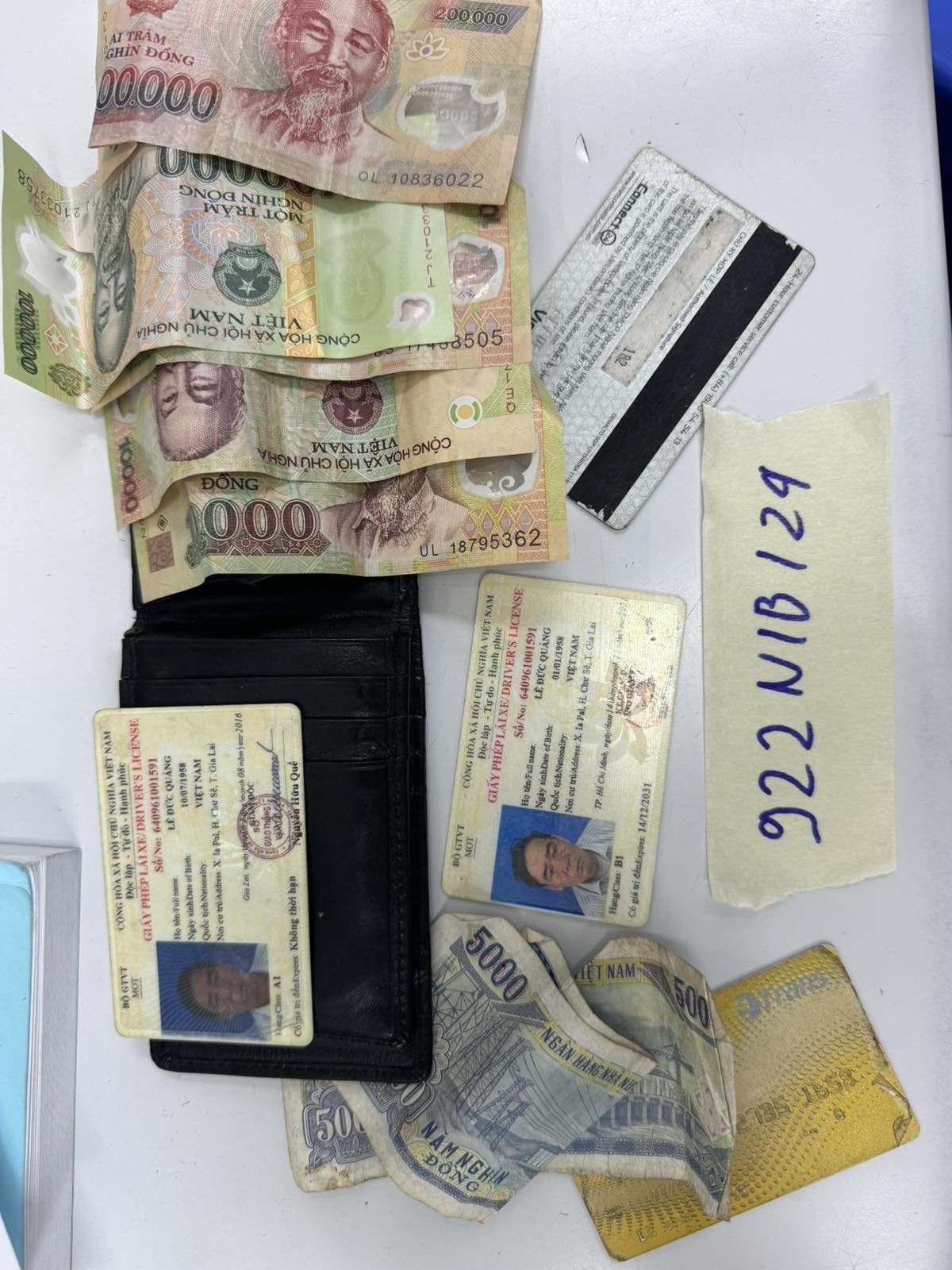 Ngày tiếp nhận: 13/6/2024 Mã hồ sơ: 922N2024B Mô tả: 01 ví đen có 02 bằng lái xe tên LÊ ĐỨC QUẢNG, 01 thẻ ngân hàng Vietcombank, 01 tờ mệnh giá 200.000 VNĐ, 01 tờ mệnh giá 100,000 VNĐ, 02 tờ mệnh giá 5,000 VNĐ, 01 thẻ ngân hàng BIDV, 03 tờ mệnh giá 10,000 VNĐ, 01 thẻ ngân hàng BIDV. |