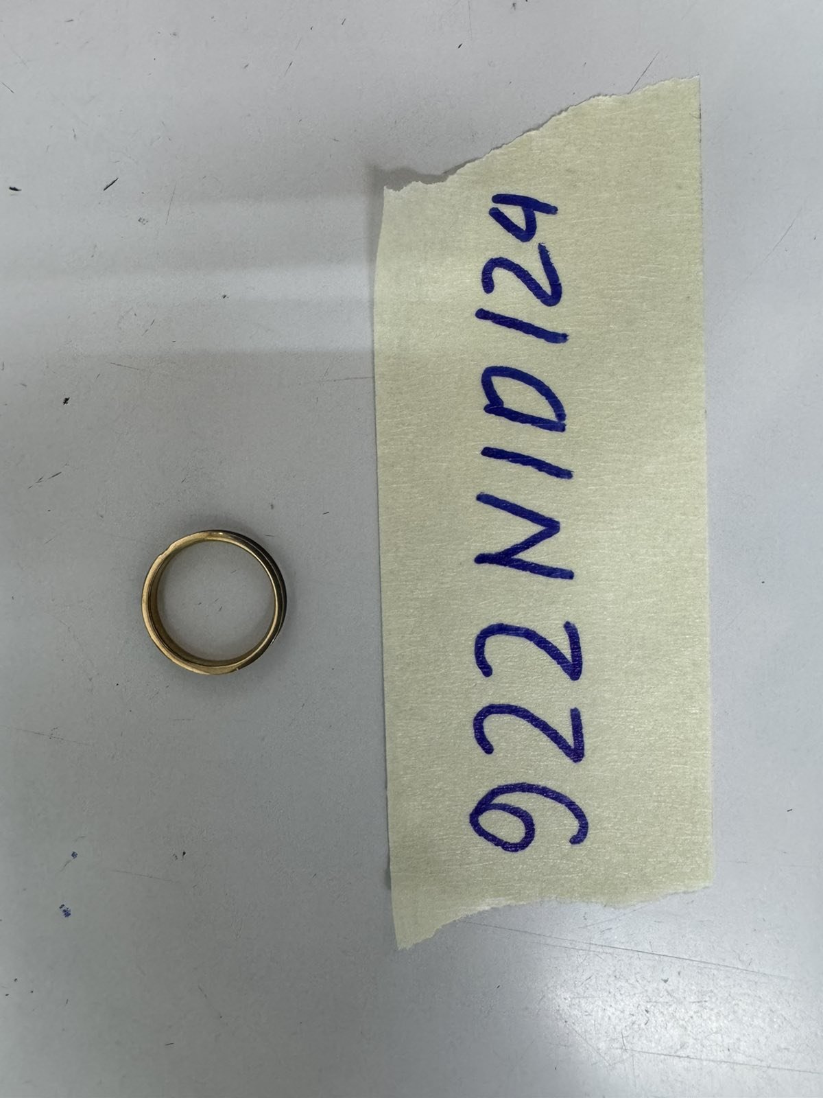 Ngày tiếp nhận: 13/6/2024 Mã hồ sơ: 922N2024D Mô tả: 01 nhẫn kim loại màu vàng, sọc đen. |