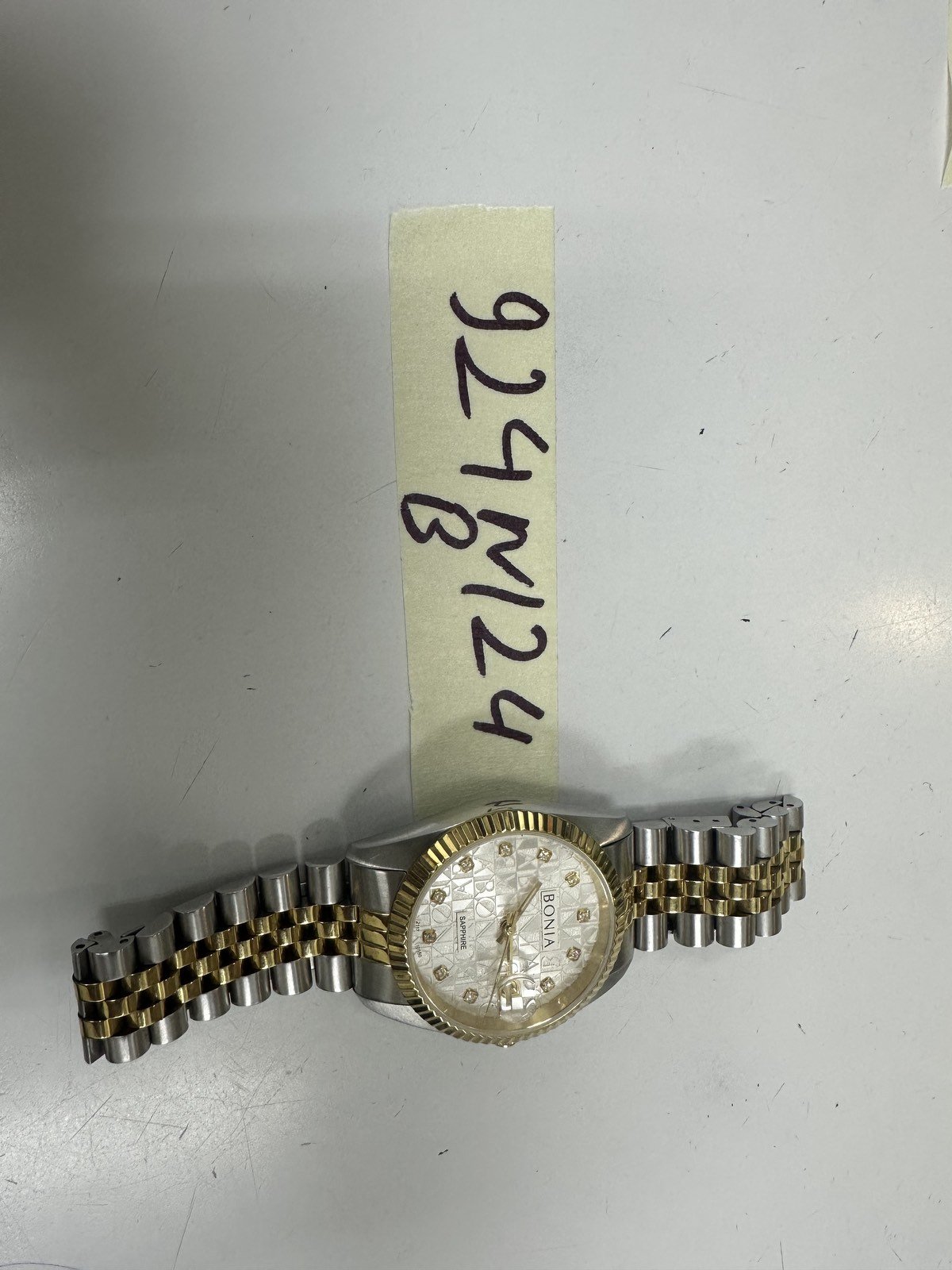Ngày tiếp nhận: 14/6/2024 Mã hồ sơ: 924N2024B Mô tả: 01 đồng hồ đeo tay bằng kim loại, mặt đồng hồ viền kim loại màu vàng và hình tròn có logo chữ BONIA. |