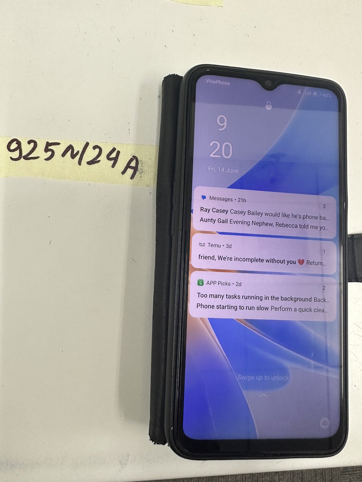 Ngày tiếp nhận: 14/6/2024 Mã hồ sơ: 925N2024A Mô tả: 01 điện thoại hiệu OPPO màu xanh navy ốp lưng màu đen bên trong ốp lưng có một số thẻ nhựa mang tên PAUL BAILEY. |
