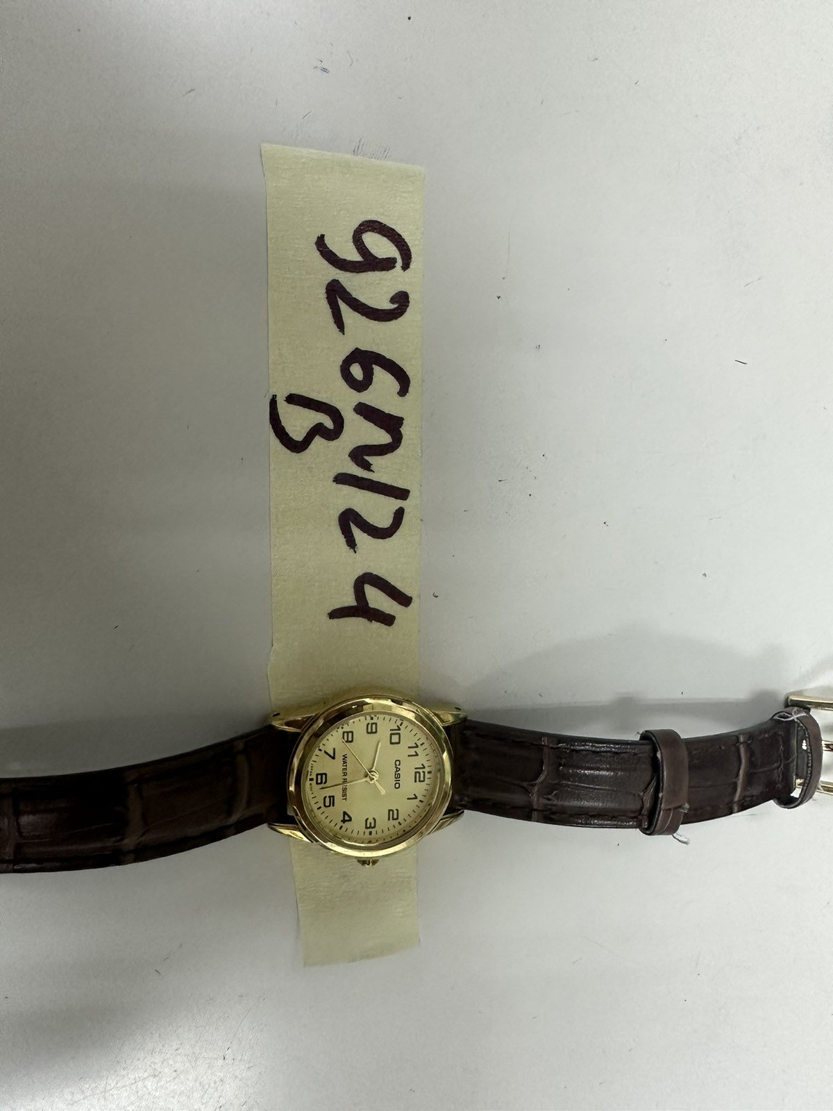 Ngày tiếp nhận: 14/6/2024 Mã hồ sơ: 926N2024B Mô tả: 01 đồng hồ kim loại màu vàng mặt số có chữ CASIO, mặt sau có dãy số LTP-V001. |