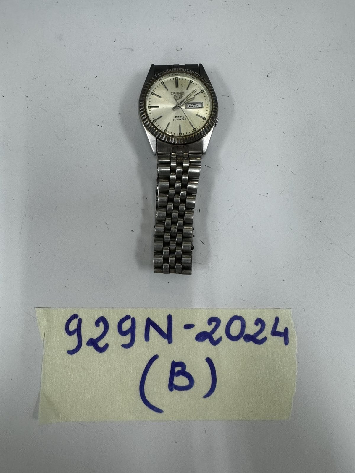 Ngày tiếp nhận: 15/6/2024 Mã hồ sơ: 929N2024B Mô tả: 01 đồng hồ dây kim loại màu bạc, mặt hình tròn có chữ SEIKO 5. |