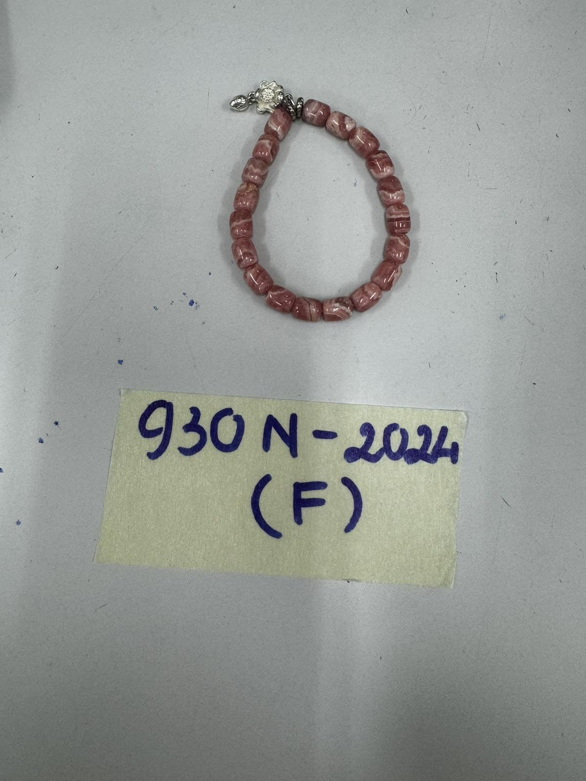Ngày tiếp nhận: 15/6/2024 Mã hồ sơ: 930N2024F Mô tả: 01 vòng tay đá hồng, có hoa 4 lá bằng kim loại. |
