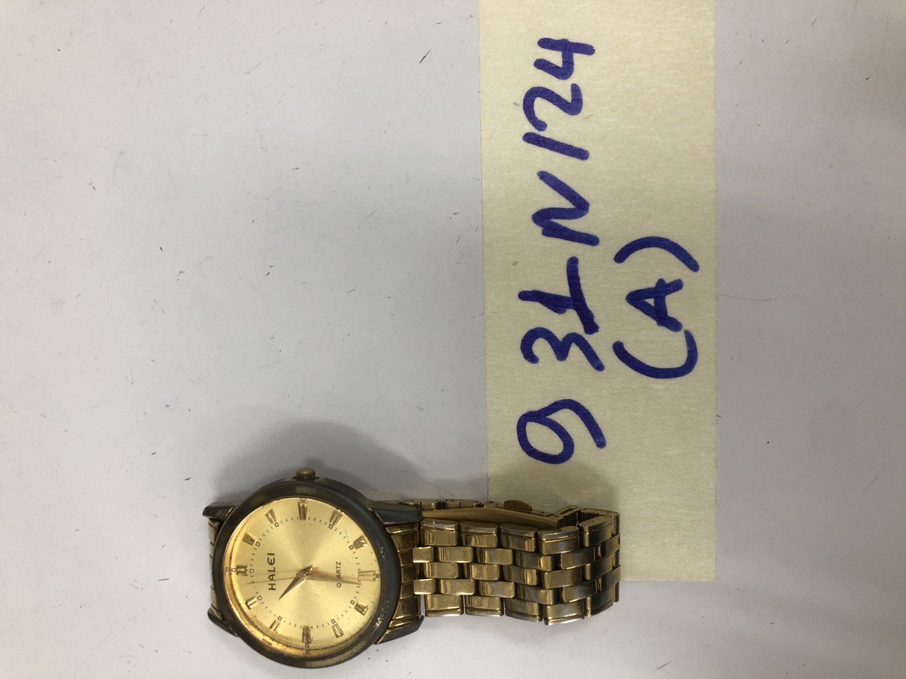 Ngày tiếp nhận: 15/6/2024 Mã hồ sơ: 931N2024A Mô tả: 01 đồng hồ mặt tròn màu vàng bên trong có ghi chữ HALEI. |