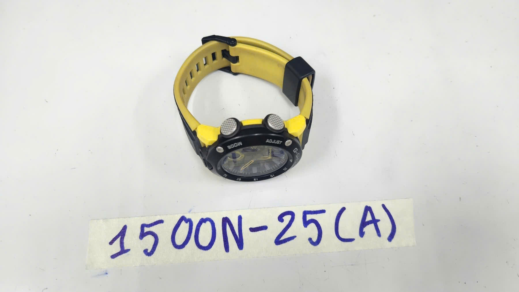Ngày tiếp nhận: 14/8/2025 Mã hồ sơ: 1500N2025A Mô tả: 01 đồng hồ màu đen vàng mang nhãn hiệu G-SHOCK CASIO, dây đeo cao su màu đen vàng. |