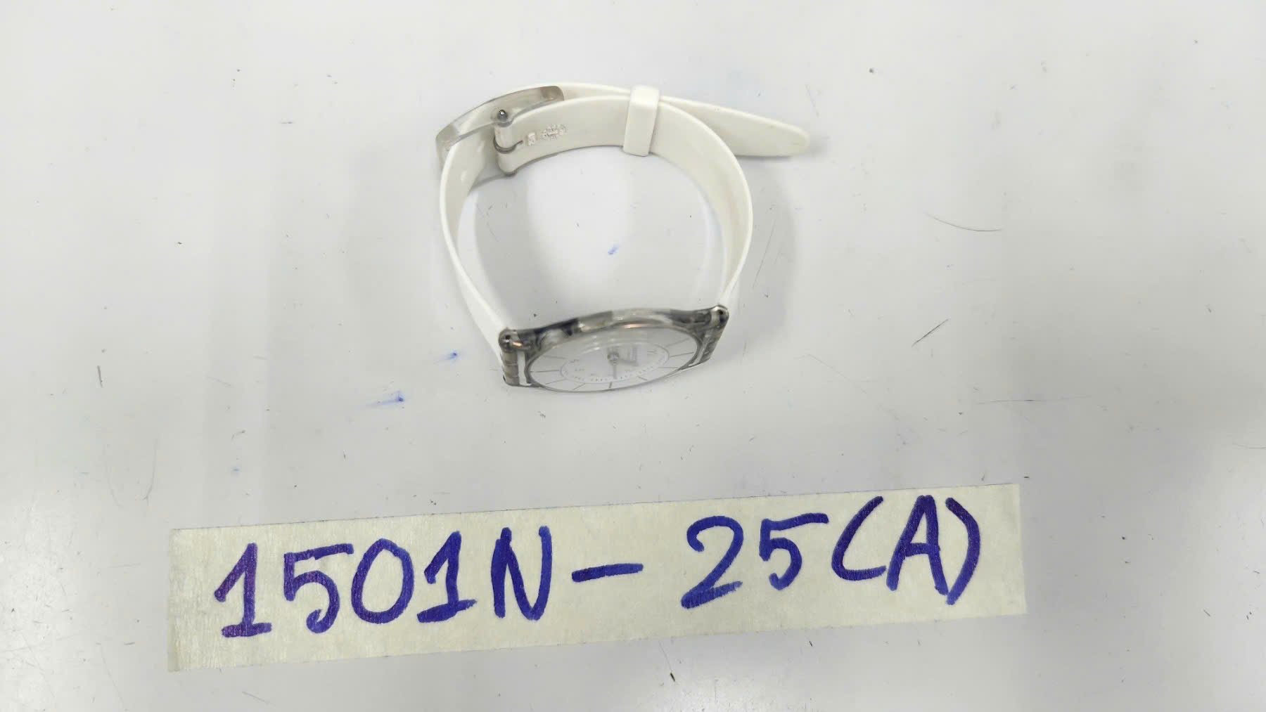 Ngày tiếp nhận: 14/8/2025 Mã hồ sơ: 1501N2025A Mô tả: 01 đồng hồ SWATCH dây nhựa màu trắng. |