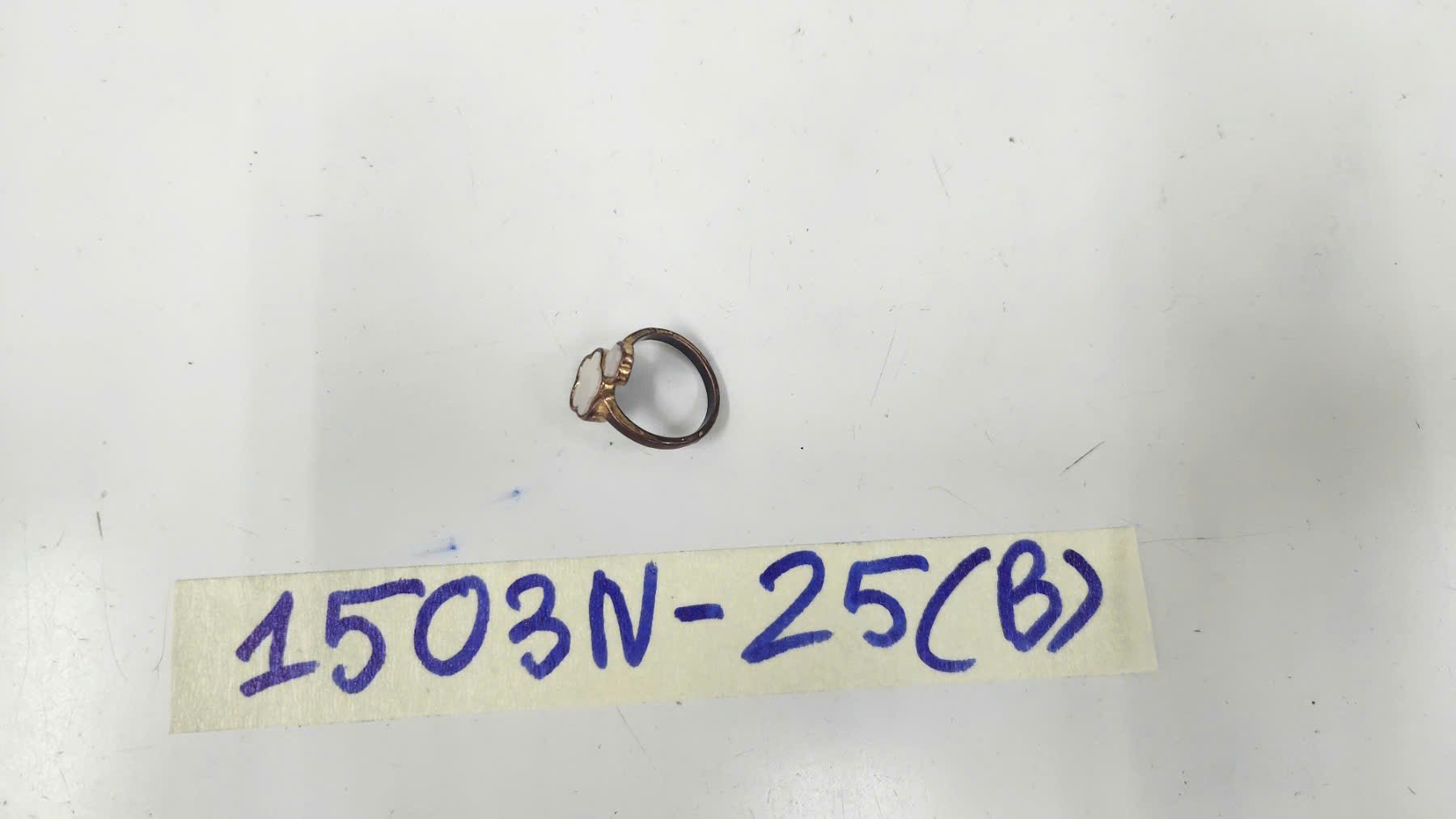 Ngày tiếp nhận: 14/8/2025 Mã hồ sơ: 1503N2025B Mô tả: 01 nhẫn màu vàng có họa tiết hình bông hoa. |