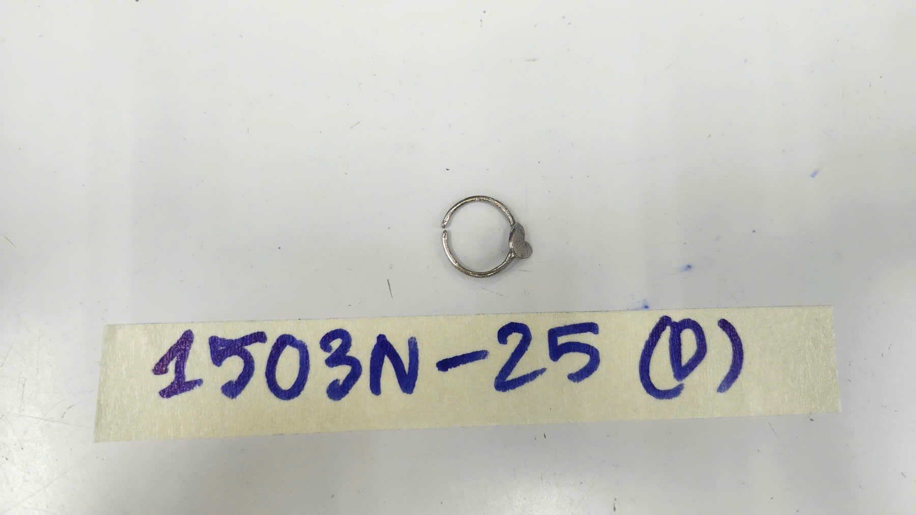 Ngày tiếp nhận: 14/8/2025 Mã hồ sơ: 1503N2025D Mô tả: 01 nhẫn màu bạc có mặt họa tiết hình trái tim. |
