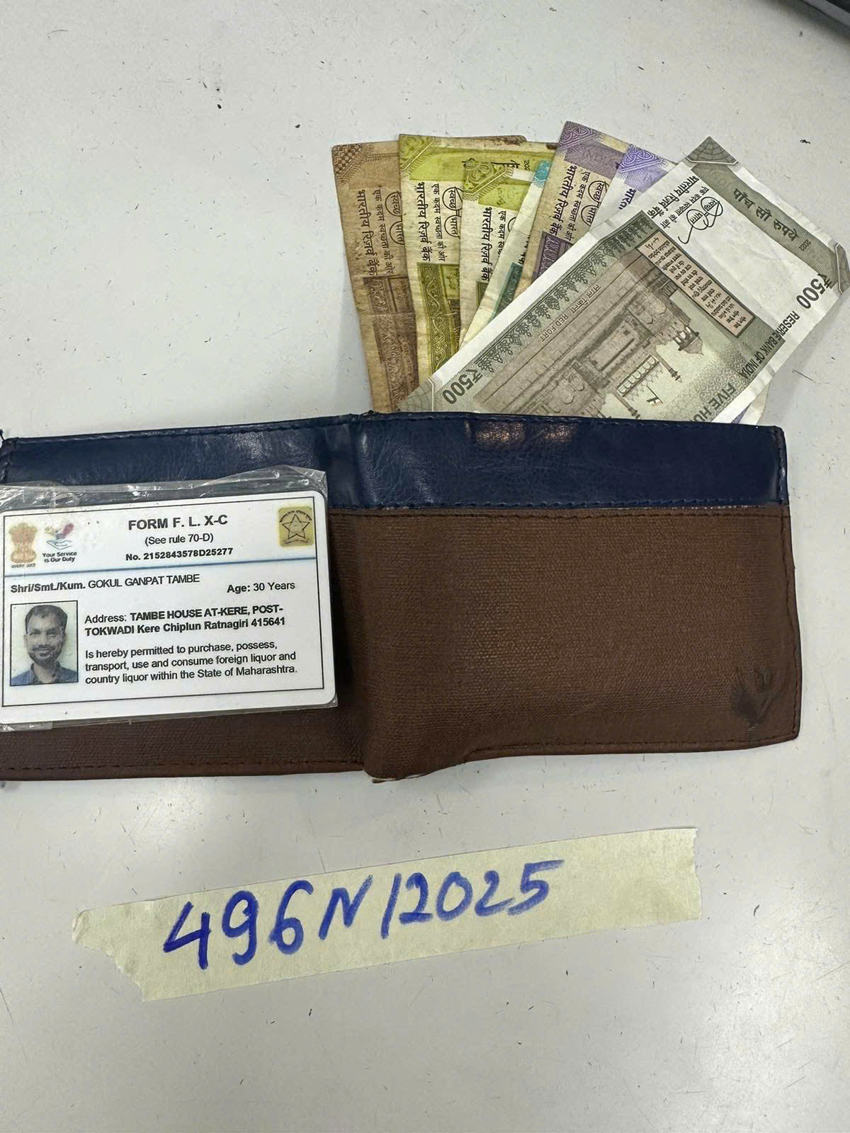 Ngày tiếp nhận: 14/03/2025 Mã hồ sơ: 496N2025 Mô tả: 01 ví vải nâu có: 800 Rupees Ấn Độ, 03 thẻ NH tên GOKUL GANPAI TAMBE. |
