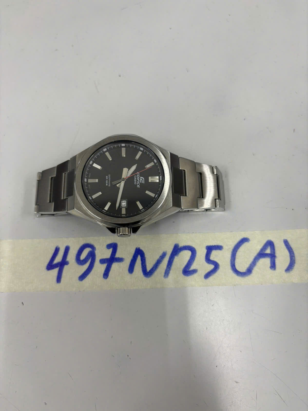 Ngày tiếp nhận: 14/03/2025 Mã hồ sơ: 497N2025A Mô tả: 01 đồng hồ mặt tròn màu bạc, mặt trong màu đen chữ EDIFICE CASIO. |