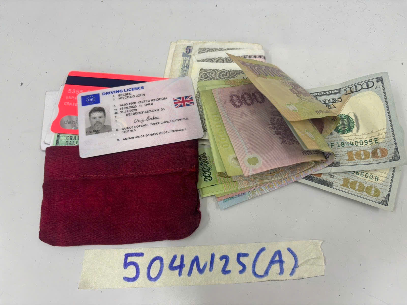 Ngày tiếp nhận: 17/03/2025 Mã hồ sơ: 504N2025A Mô tả: 01 ví tiền vải màu đỏ, gồm: 200 USD (hai trăm đô-la Mỹ), 498.000 VNĐ (bốn trăm chín mươi tám nghìn Việt Nam Đồng), 05 thẻ nhựa trong đó có 03 thẻ nhựa mang tên GRAIG BEEBEE. |