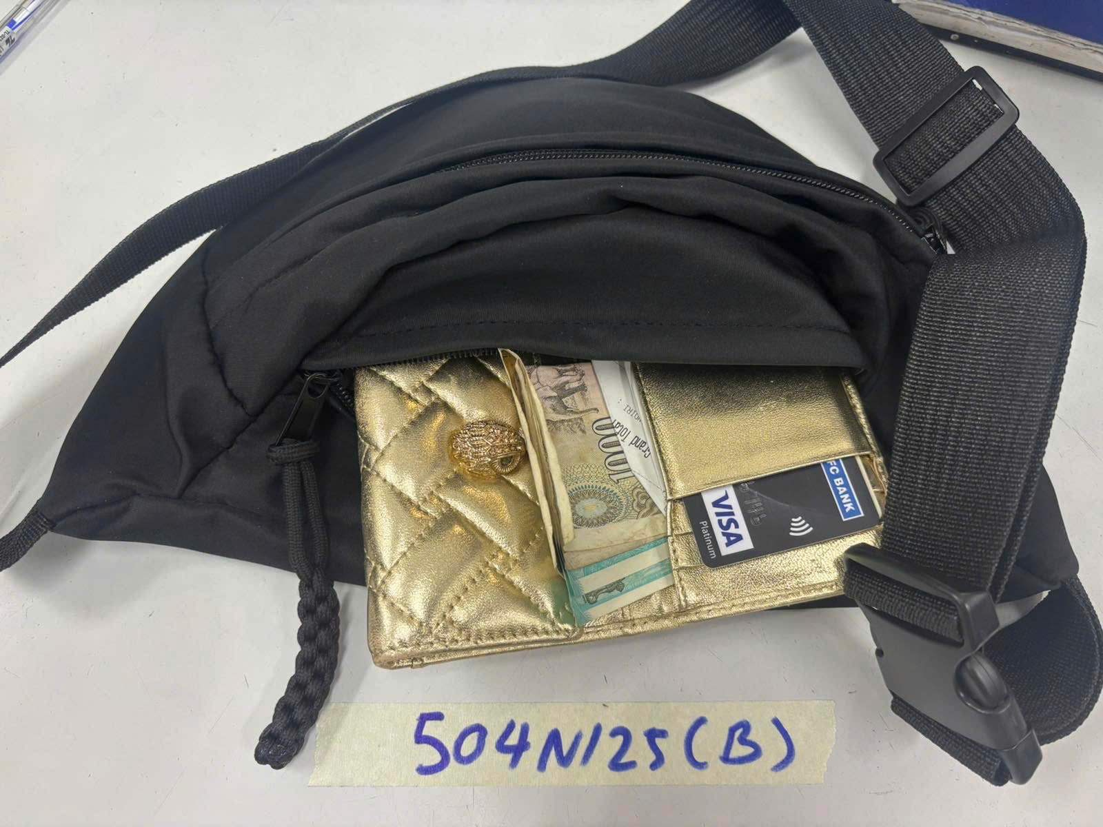 Ngày tiếp nhận: 17/03/2025 Mã hồ sơ: 504N2025B Mô tả: 01 túi vải đen, bên trong gồm: 01 ví màu vàng có: 2.000VNĐ, 50 Rupees, 03 thẻ nhựa mang tên SREERAMULA USHAKIRAN. |