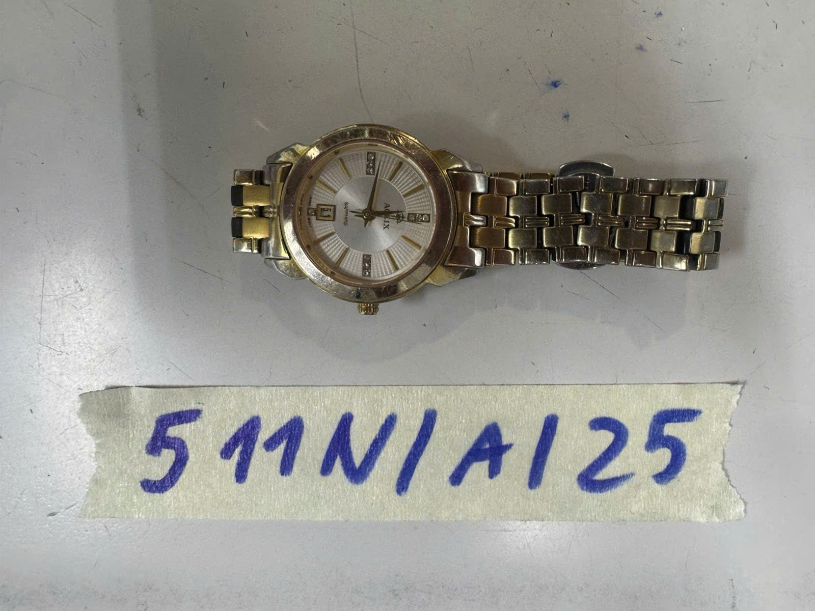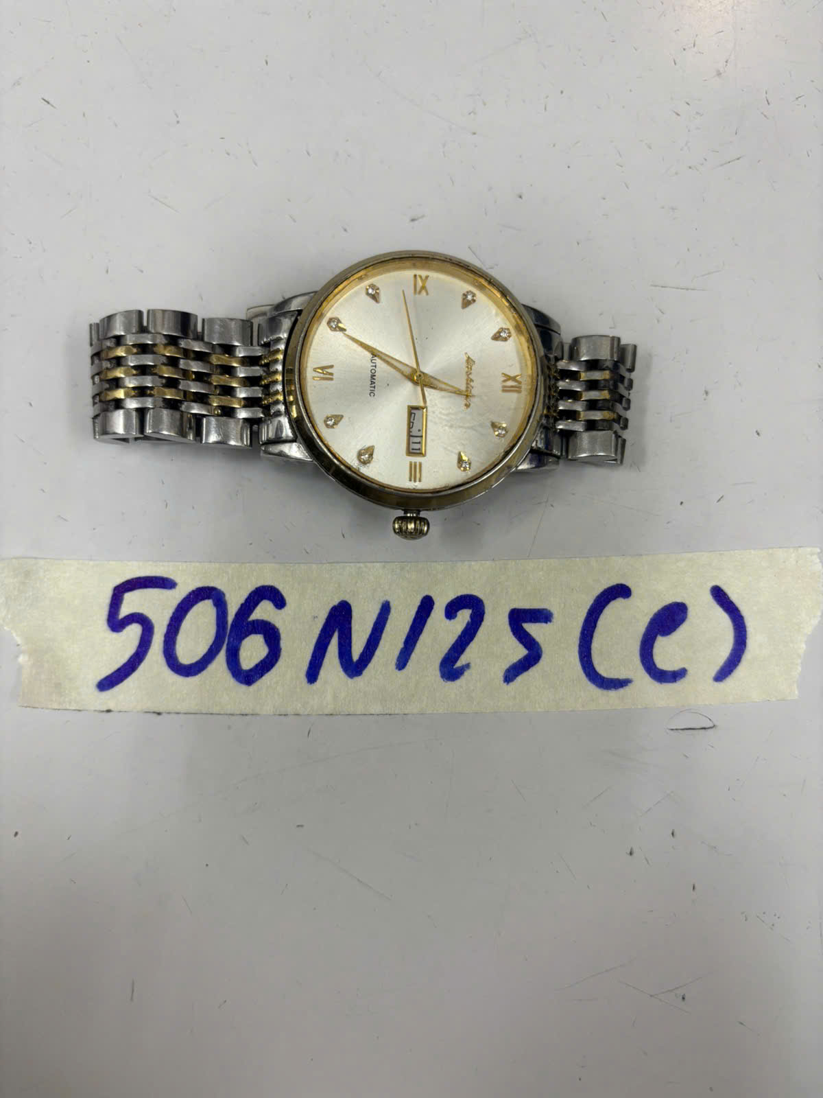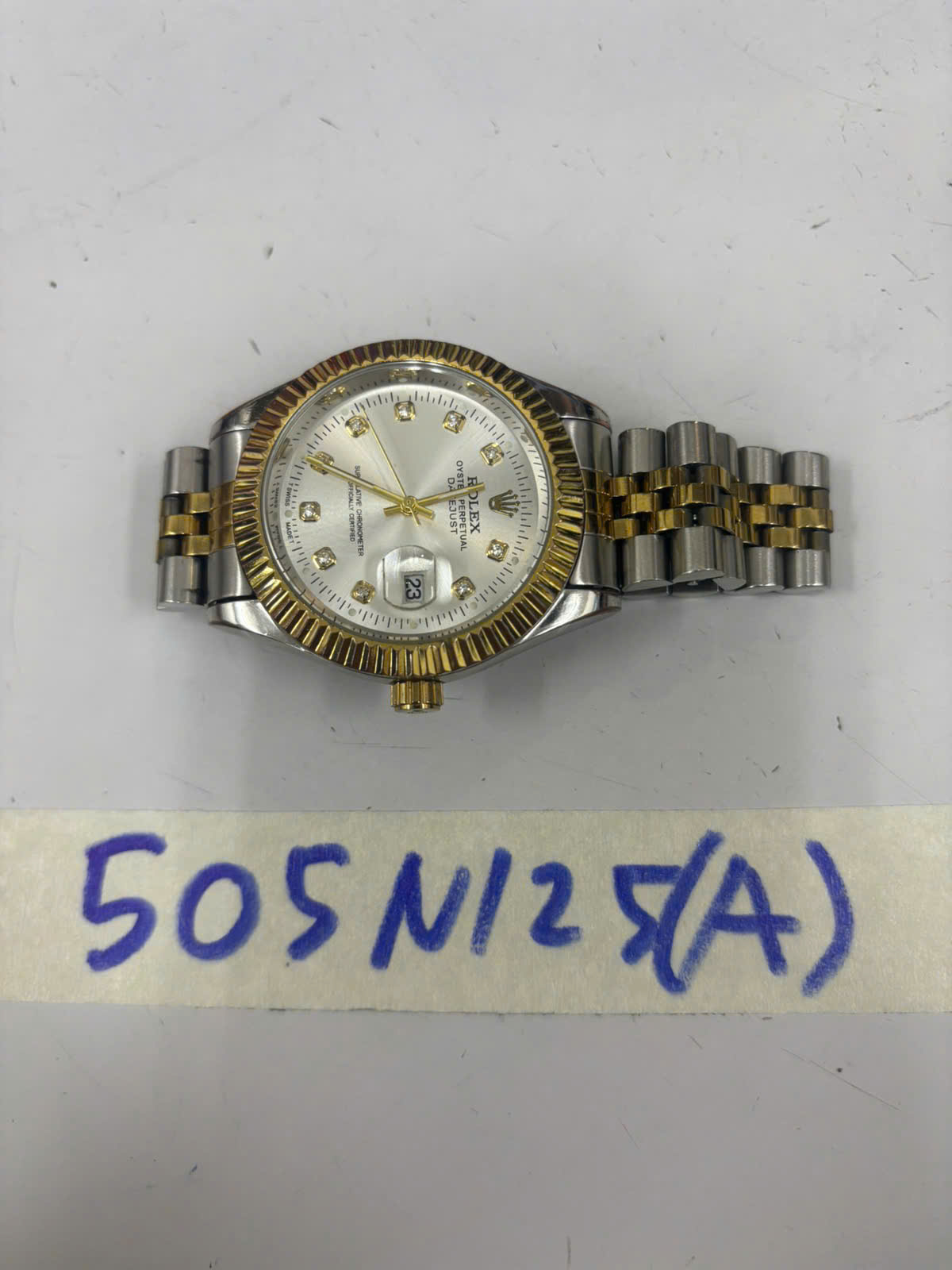 Ngày tiếp nhận: 17/03/2025 Mã hồ sơ: 505N2025A Mô tả: 01 đồng hồ bằng kim loại màu trắng sọc giữa màu vàng, mặt đồng hồ hình tròn a logo chữ "ROLEX". |