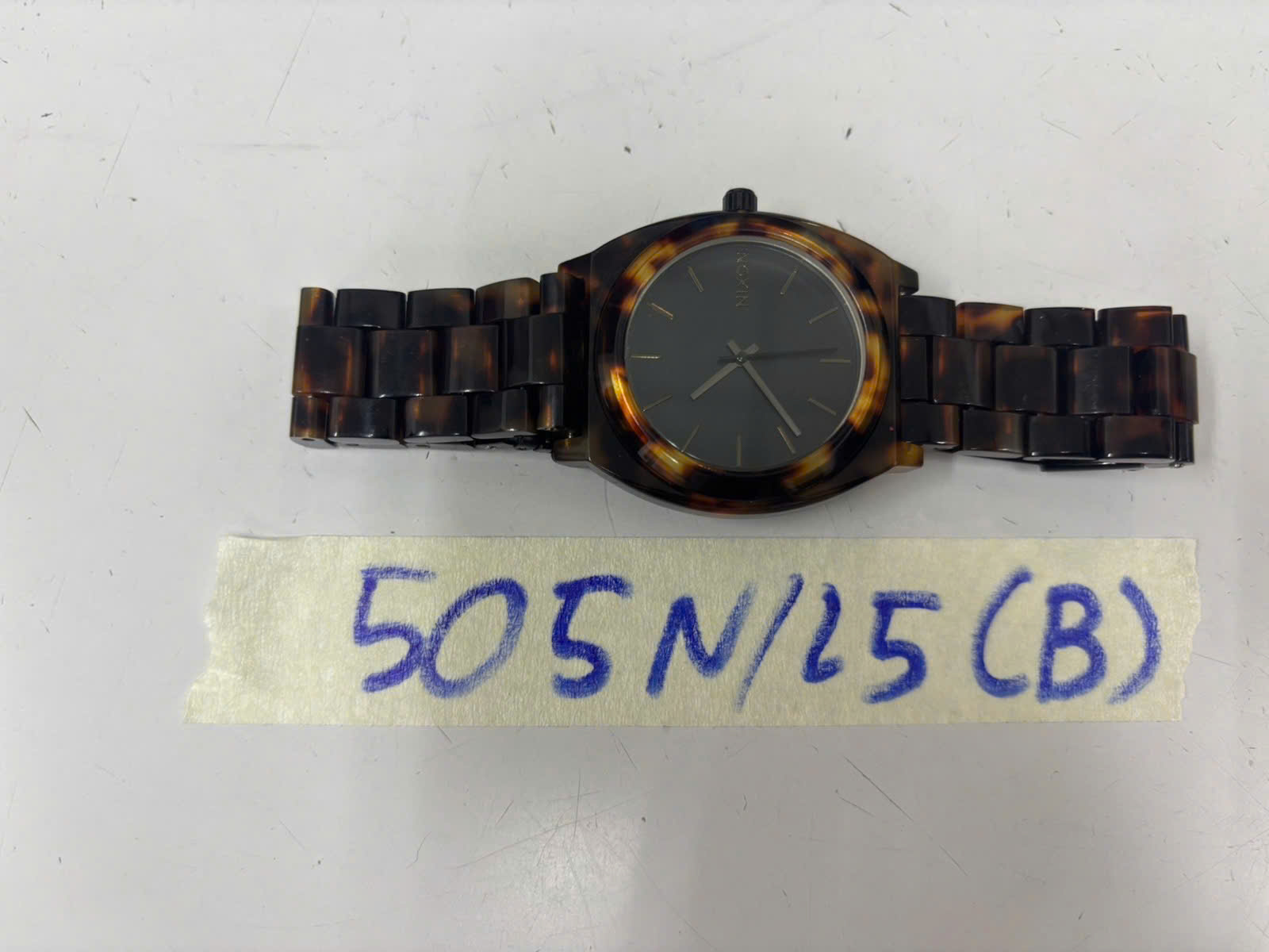 Ngày tiếp nhận: 17/03/2025 Mã hồ sơ: 505N2025B Mô tả: 01 đồng hồ bằng nhựa màu nâu, mặt đồng hồ hình tròn có logo chữ "NIXON". |