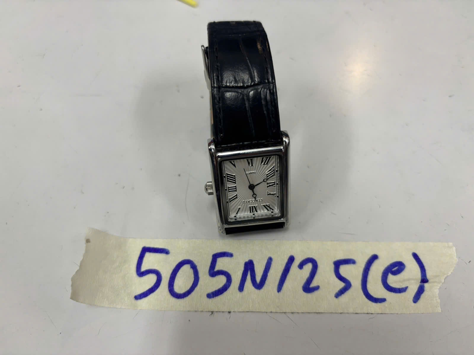 Ngày tiếp nhận: 17/03/2025 Mã hồ sơ: 505N2025C Mô tả: 01 đồng hồ có mặt hình chữ nhật, logo chữ "STACCATO", dây đồng hồ màu đen. |
