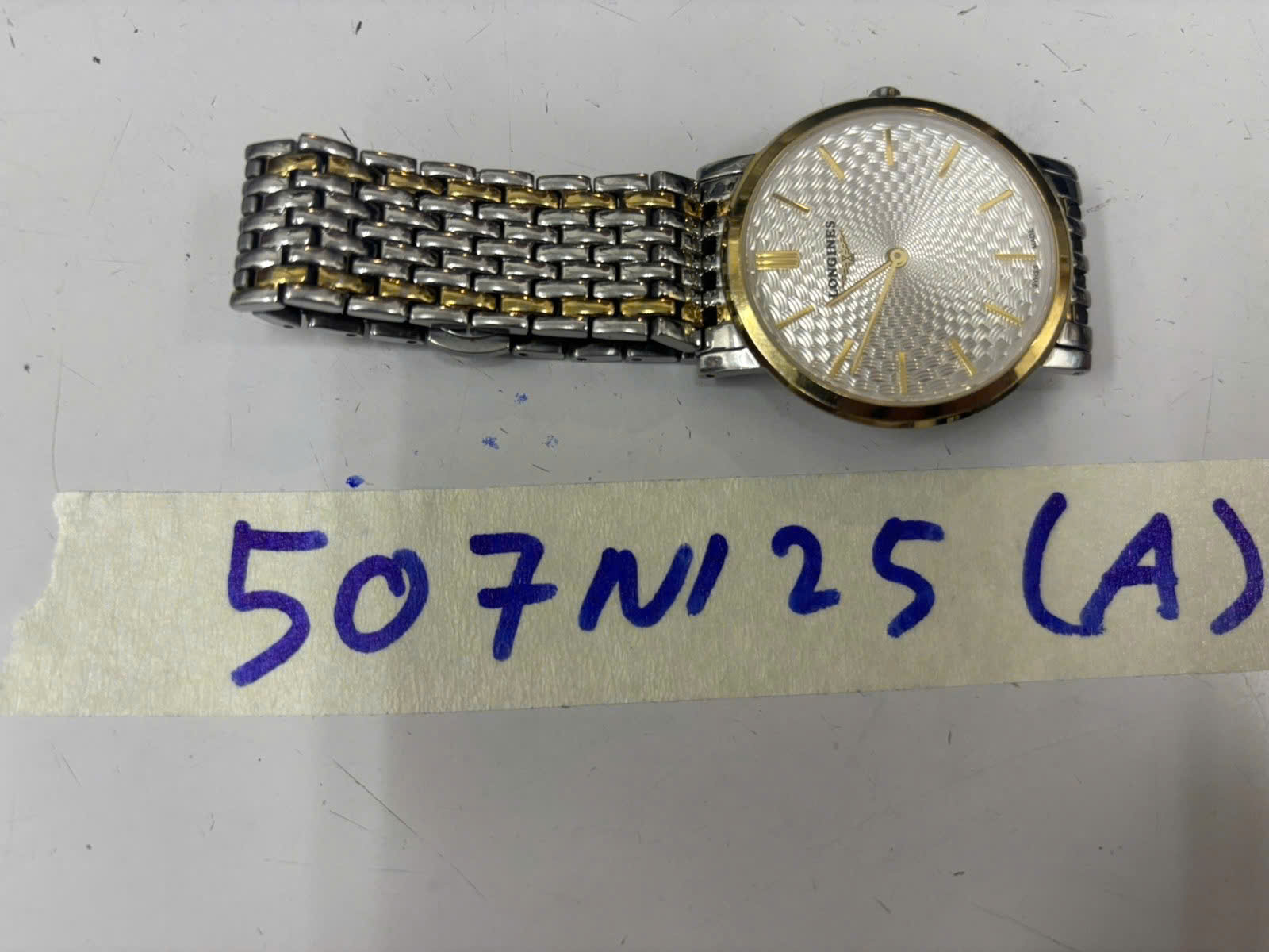 Ngày tiếp nhận: 17/03/2025 Mã hồ sơ: 507N2025A Mô tả: 01 đồng hồ bằng kim loại, mặt đồng hồ hình tròn có chữ "LONGINES", dây kim loại màu bạc xen màu vàng. |