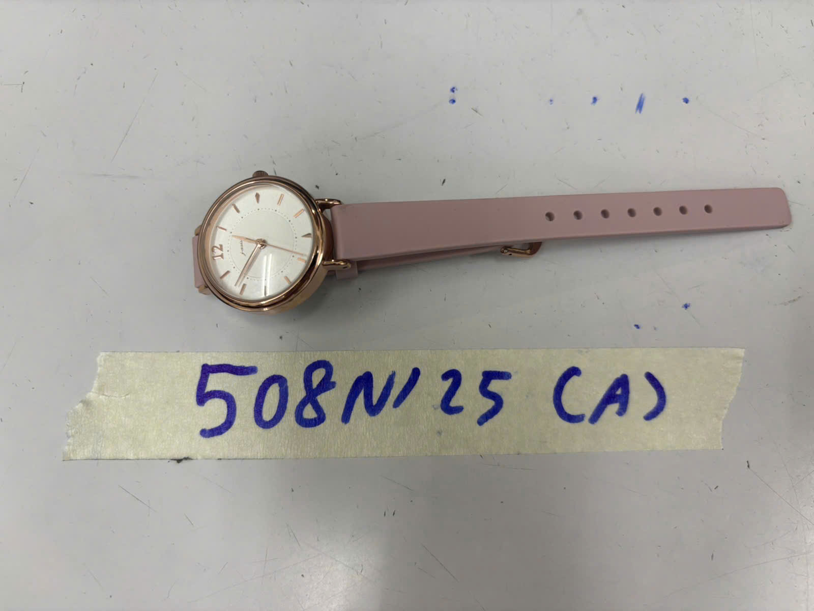 Ngày tiếp nhận: 17/03/2025 Mã hồ sơ: 508N2025A Mô tả: 01 đồng hồ bằng kim loại màu vàng, mặt đồng hồ hình tròn có chữ "J-AXIS", dây nhựa màu hông, mặt sau có sô 814730. |