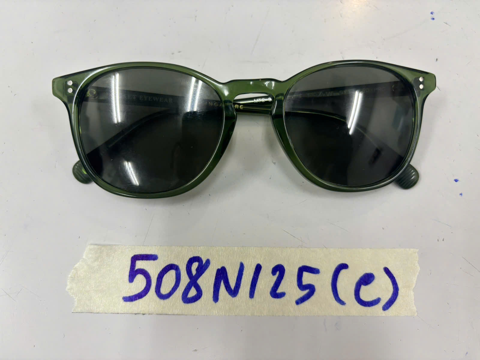 Ngày tiếp nhận: 17/03/2025 Mã hồ sơ: 508N2025C Mô tả: 01 mắt kính đen gọng bằng nhựa trong, màu xanh lá có logo chữ "ROCKET EYEWEAR". |