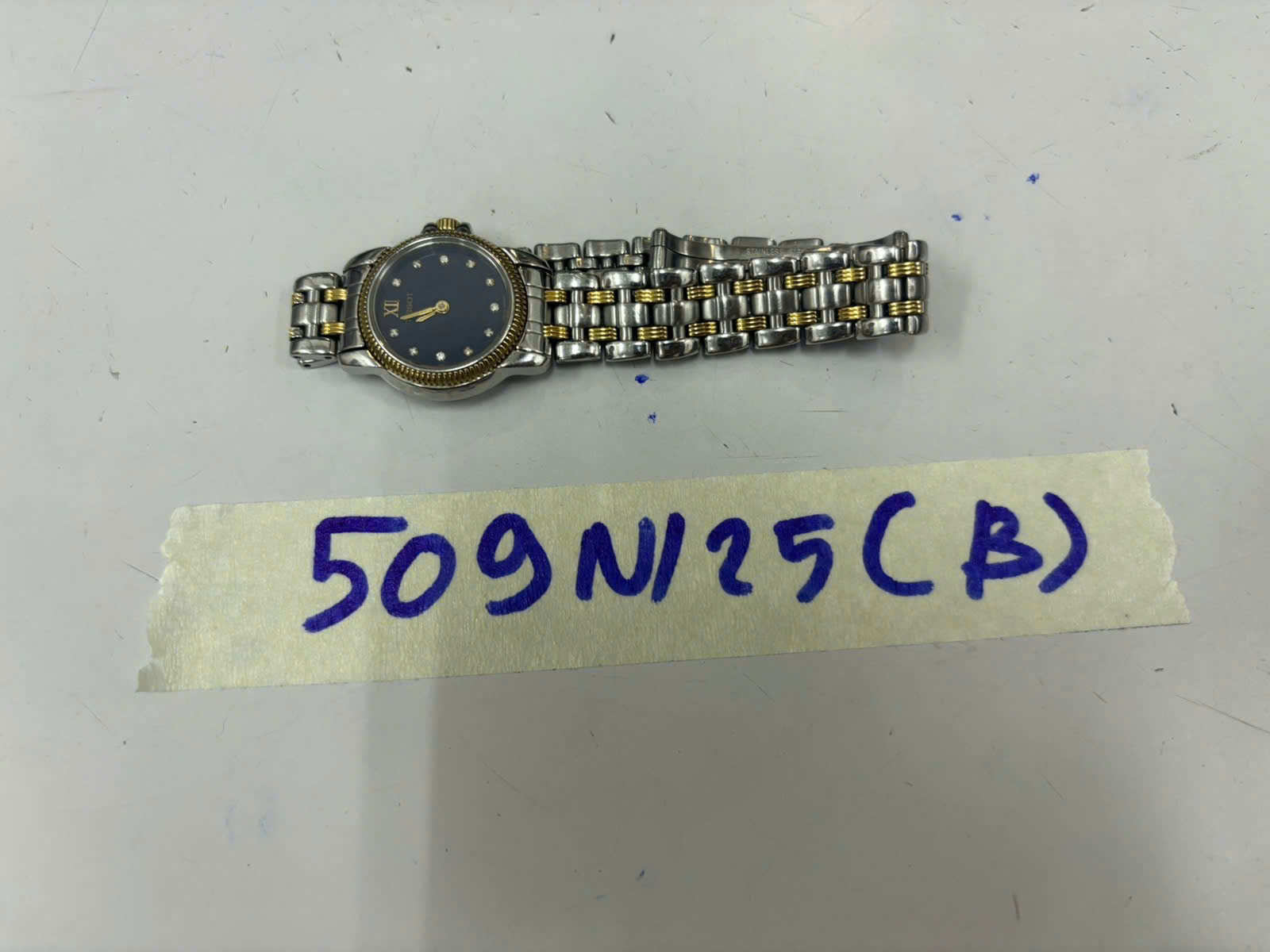 Ngày tiếp nhận: 17/03/2025 Mã hồ sơ: 509N2025B Mô tả: 01 đồng hồ kim loại mặt màu xanh có chữ TISSOT, viền màu vàng, dây đeo kim loại màu trắng. |