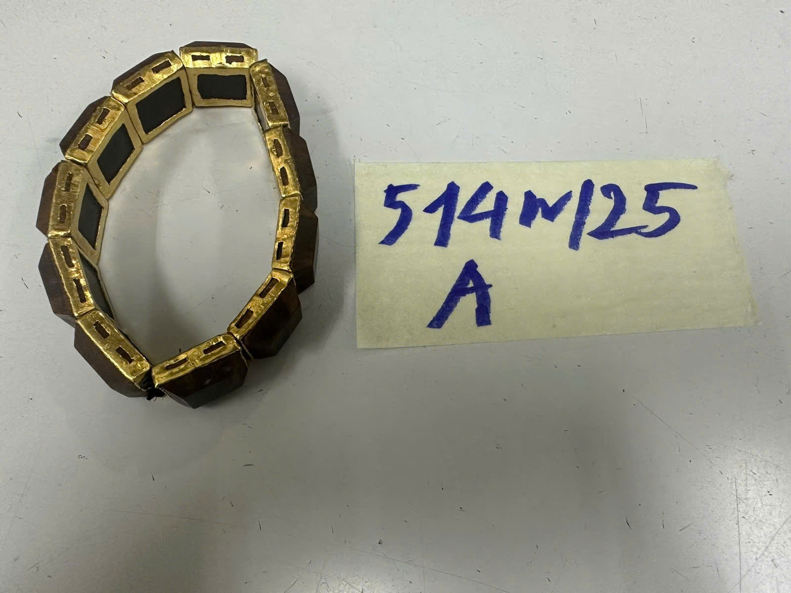 Ngày tiếp nhận: 18/03/2025 Mã hồ sơ: 514N2025A Mô tả: 01 dây đeo tay bằng gỗ viền kim loại màu vàng. |