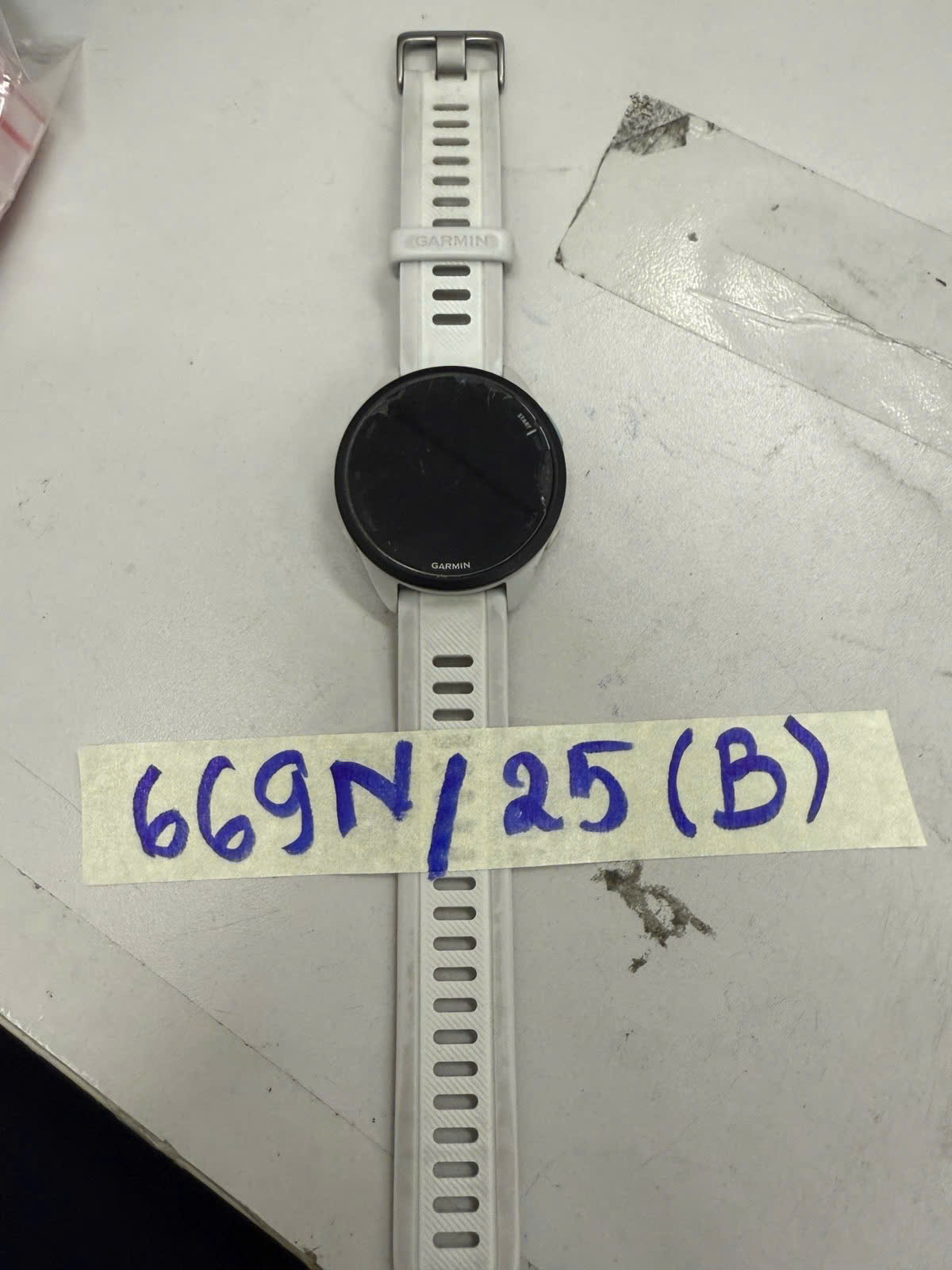Ngày tiếp nhận: 14/4/2025 Mã hồ sơ: 669N2025B Mô tả: 01 đồng hồ thông minh, mặt tròn màu đen có chữ GARMIN, dây da màu trắng. |