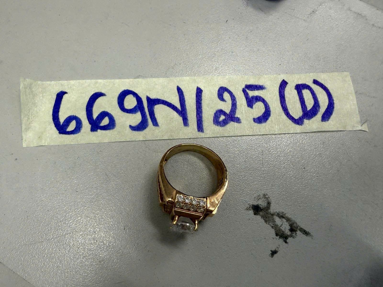 Ngày tiếp nhận: 14/4/2025 Mã hồ sơ: 669N2025D Mô tả: 01 nhẫn kim loại màu vàng có đính đá. |