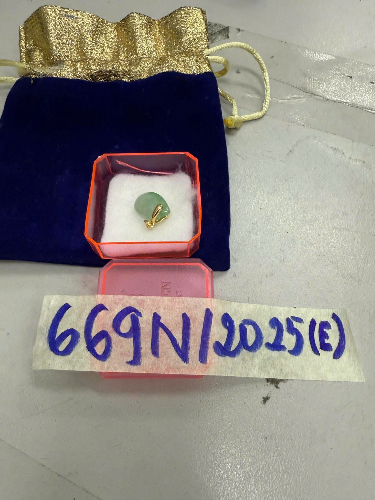 Ngày tiếp nhận: 14/4/2025 Mã hồ sơ: 669N2025E Mô tả: 01 mặt dây chuyền kim loại màu vàng có đính đá màu xanh ngọc hình giọt nước. |