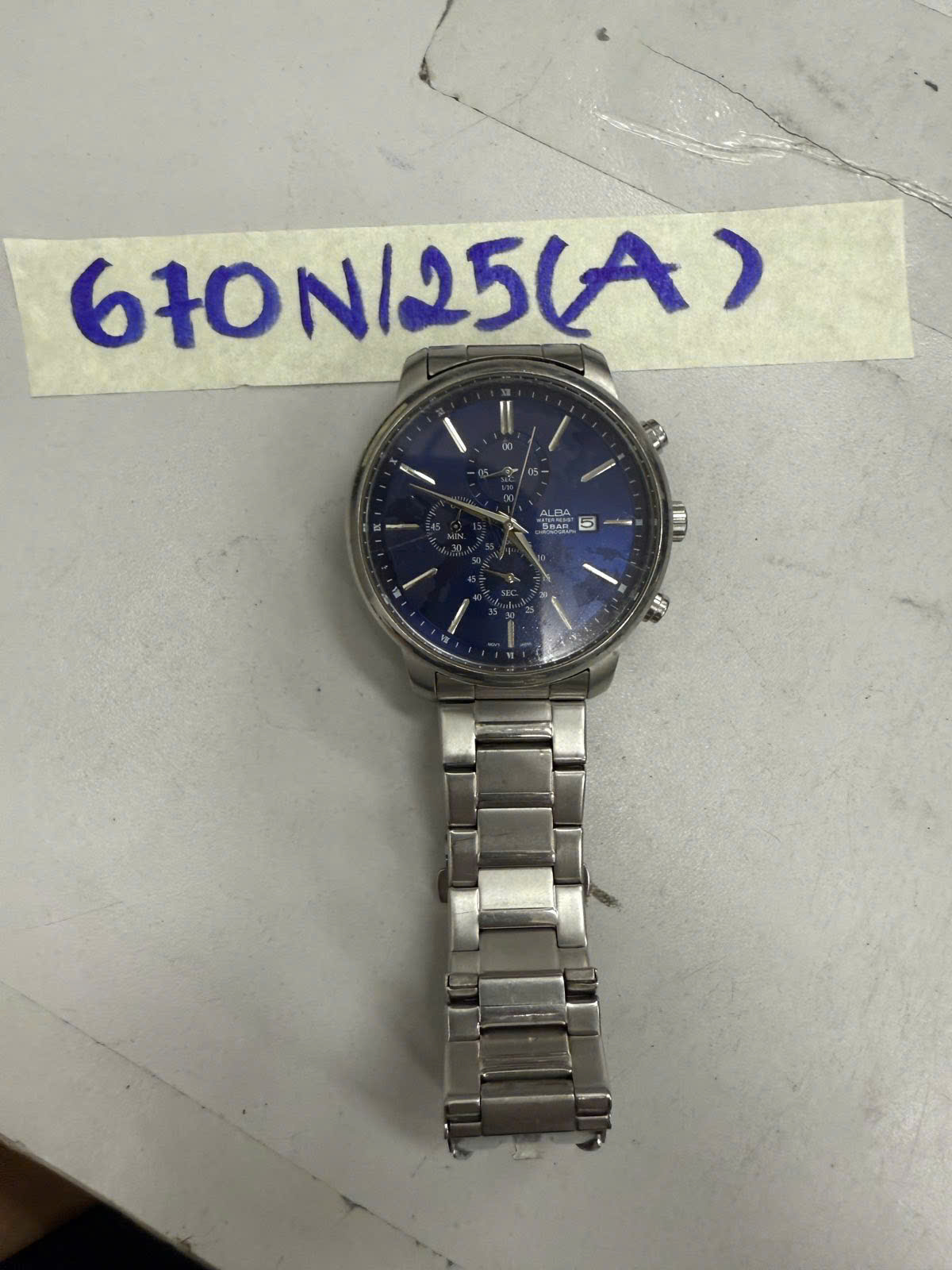 Ngày tiếp nhận: 14/4/2025 Mã hồ sơ: 670N2025A Mô tả: 01 Đồng hồ đeo tay dây kim loại màu trắng, mặt đồng hồ hình tròn màu xanh có chữ “ALBA” (đã qua sử dụng). |