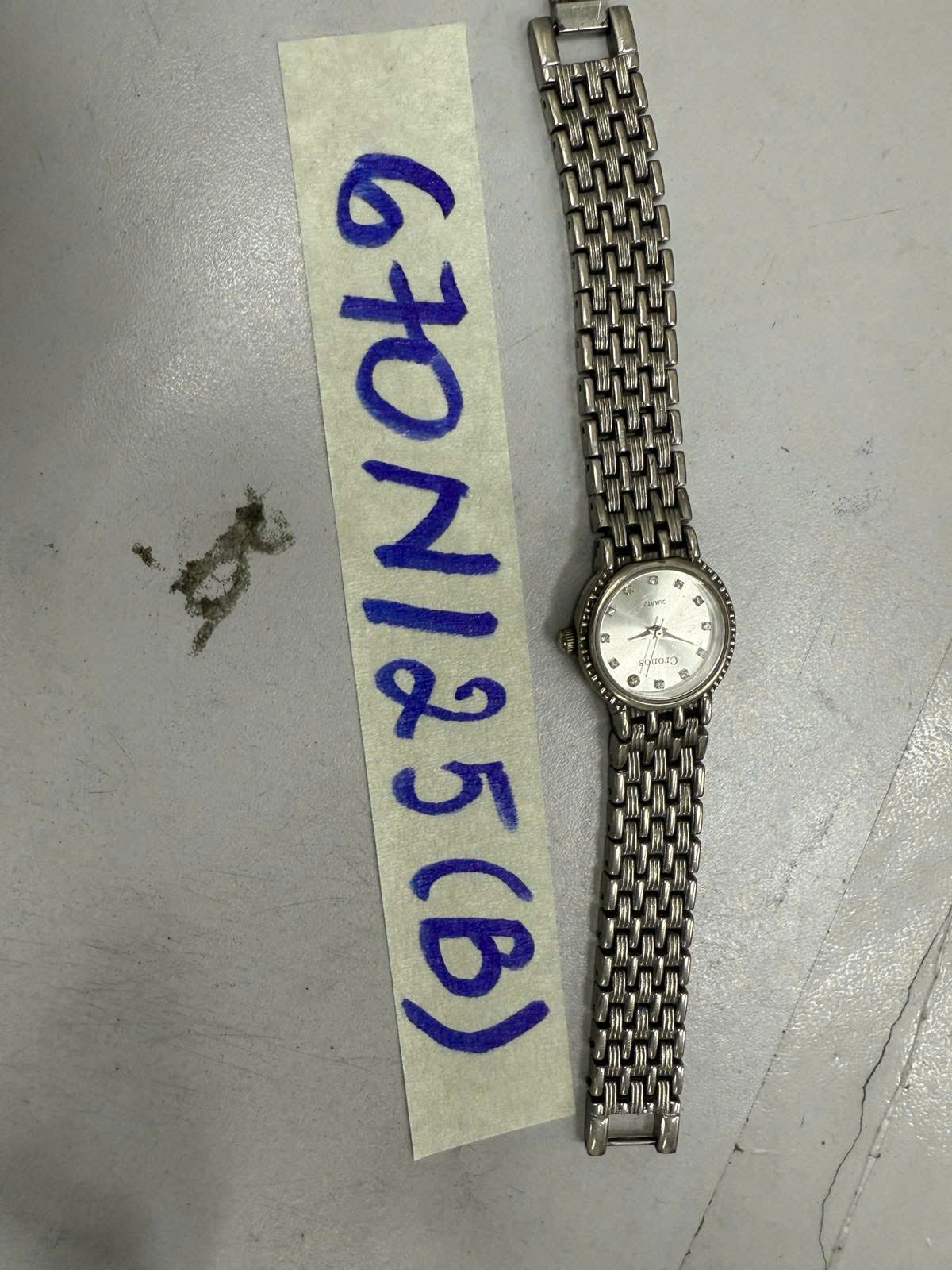 Ngày tiếp nhận: 14/4/2025 Mã hồ sơ: 670N2025B Mô tả: 01 Đồng hồ dây kim loại màu trắng, mặt đồng hồ hình tròn màu xám có chữ “Cronos” (đã qua sử dụng). |