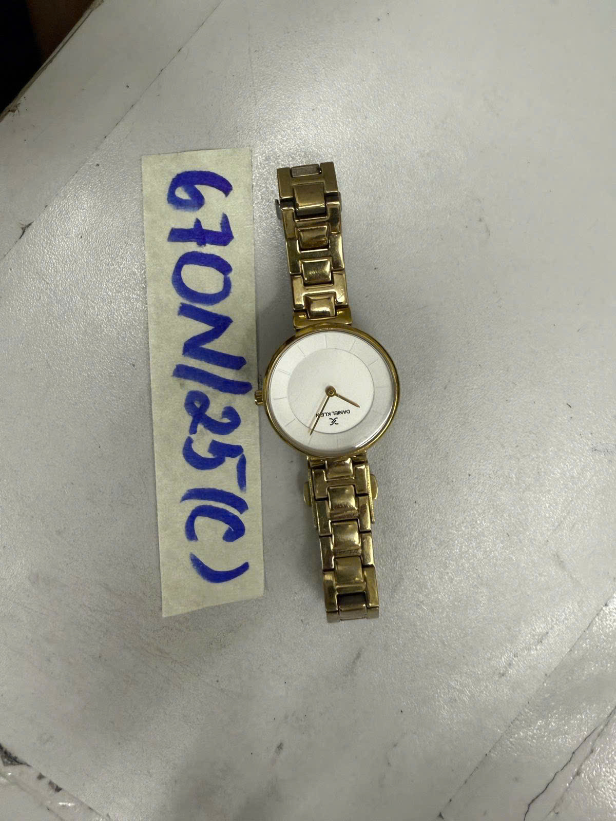 Ngày tiếp nhận: 14/4/2025 Mã hồ sơ: 670N2025C Mô tả: 01 Đồng hồ dây kim loại màu xám, mặt đồng hồ hình tròn màu trắng có chữ “DANIEL KLEIN” (đã qua sử dụng). |