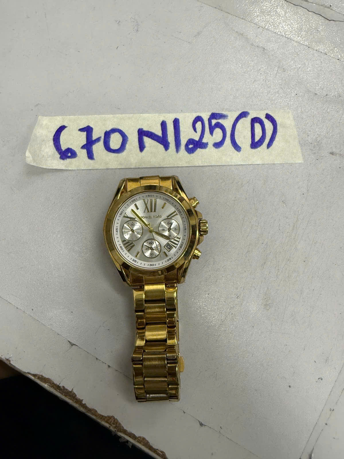 Ngày tiếp nhận: 14/4/2025 Mã hồ sơ: 670N2025D Mô tả: 01 Đồng hồ dây kim loại màu vàng, mặt đồng hồ hình tròn màu trắng có chữ “Michael Kors” (đã qua sử dụng). |