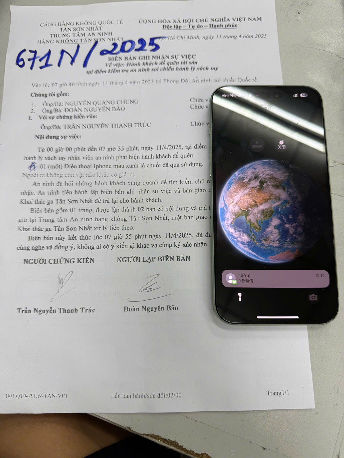 Ngày tiếp nhận: 14/4/2025 Mã hồ sơ: 671N2025 Mô tả: 01 Điện thoại iPhone màu xanh lá chuối (đã qua sử dụng). |