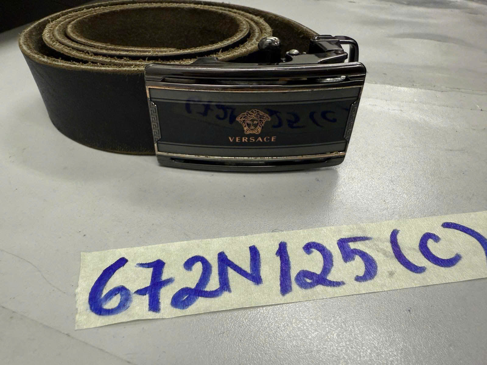 Ngày tiếp nhận: 14/4/2025 Mã hồ sơ: 672N2025C Mô tả: 01 Dây lưng da màu đen có chữ Versace. |