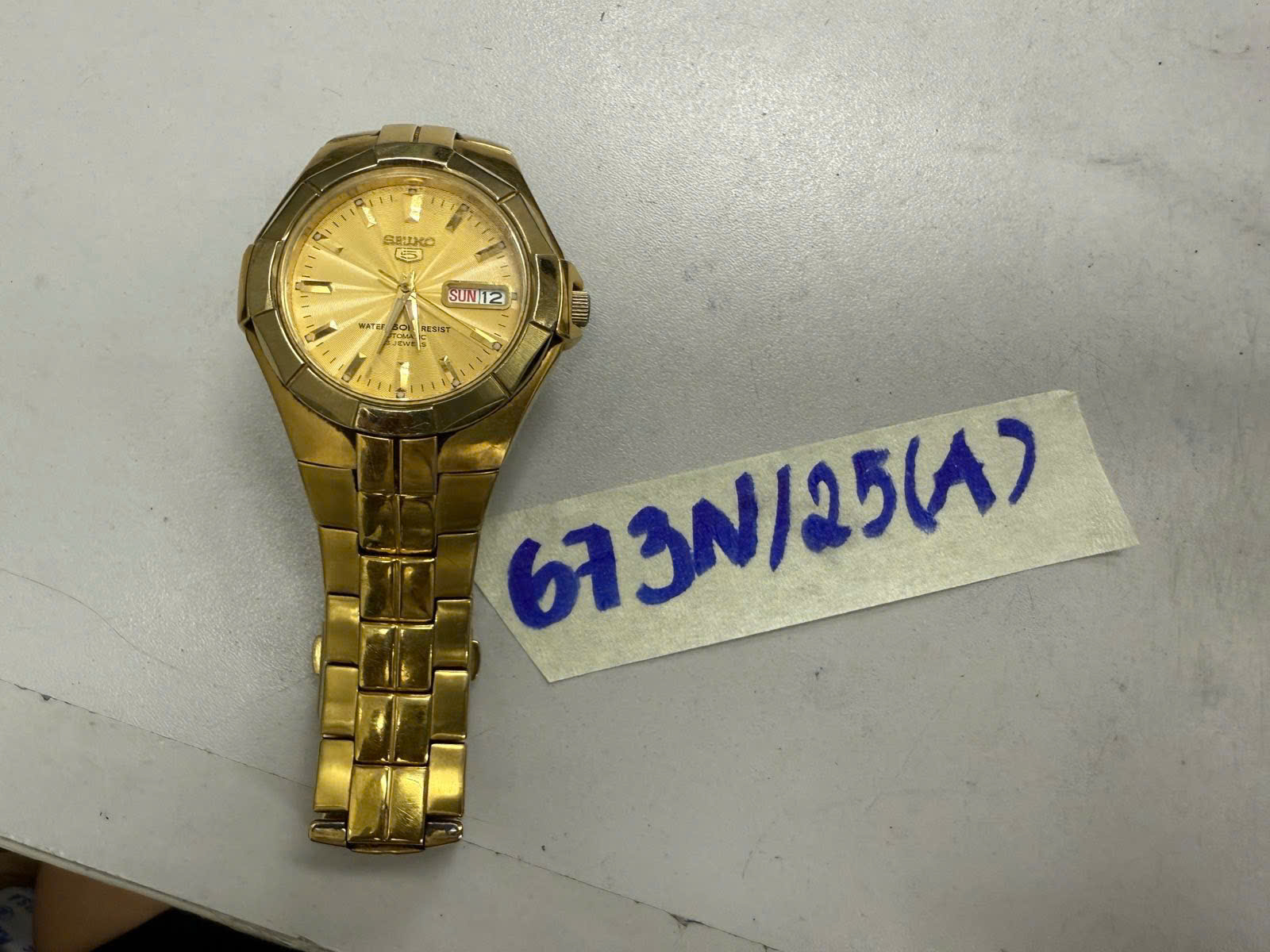 Ngày tiếp nhận: 14/4/2025 Mã hồ sơ: 673N2025A Mô tả: 01 Đồng hồ dây kim loại màu vàng, mặt đồng hồ hình tròn màu vàng có chữ “Seiko” (đã qua sử dụng). |