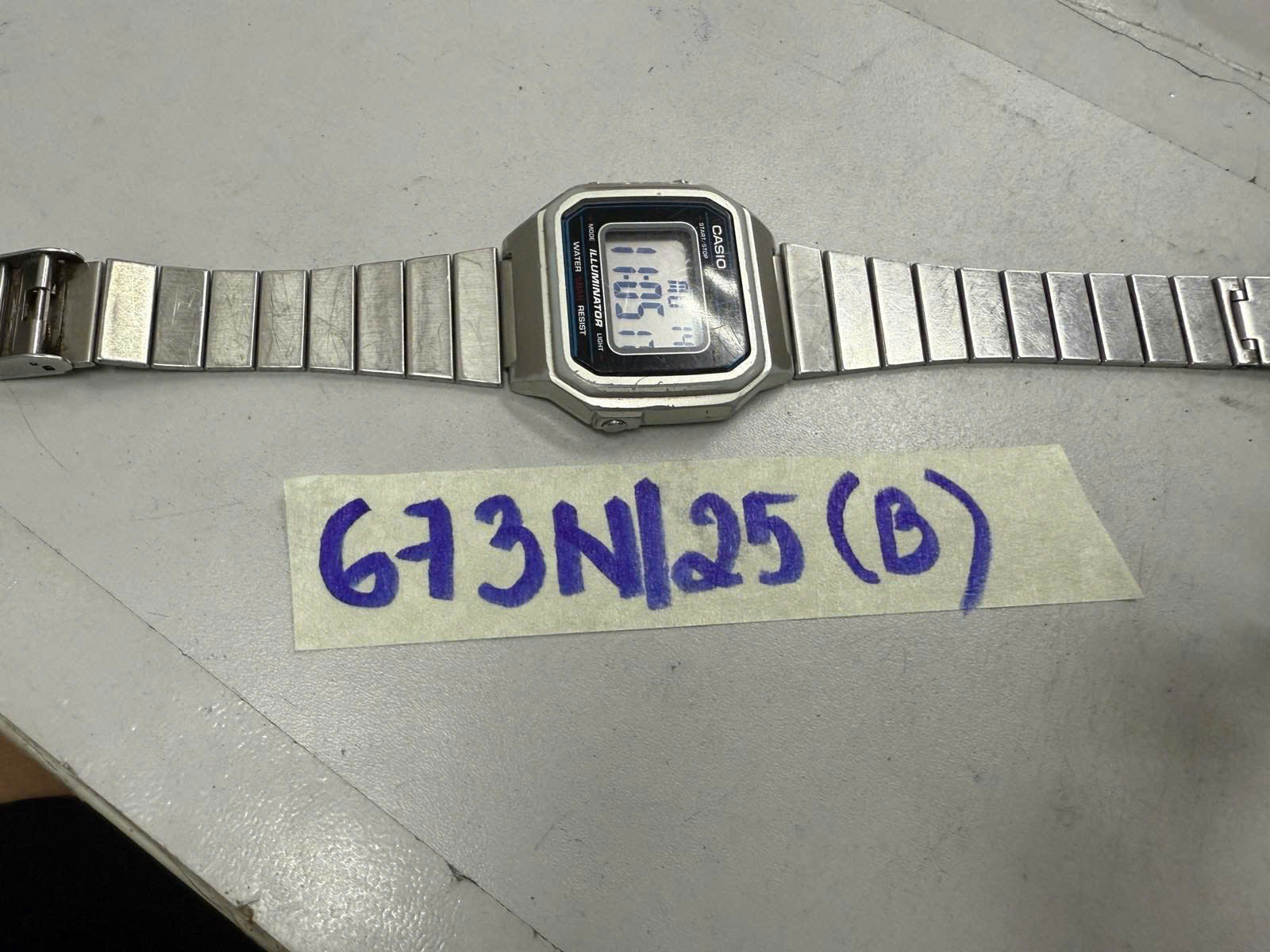 Ngày tiếp nhận: 14/4/2025 Mã hồ sơ: 673N2025B Mô tả: 01 Đồng hồ dây kim loại màu trắng, mặt đồng hồ hình chữ nhật có chữ “CASIO” (đã qua sử dụng). |