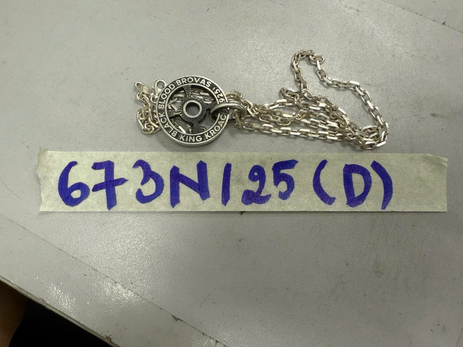 Ngày tiếp nhận: 14/4/2025 Mã hồ sơ: 673N2025D Mô tả: 01 dây chuyền kim loại màu trắng, mặt dây chuyền có chữ “NO PAIN NO GAIN”. |