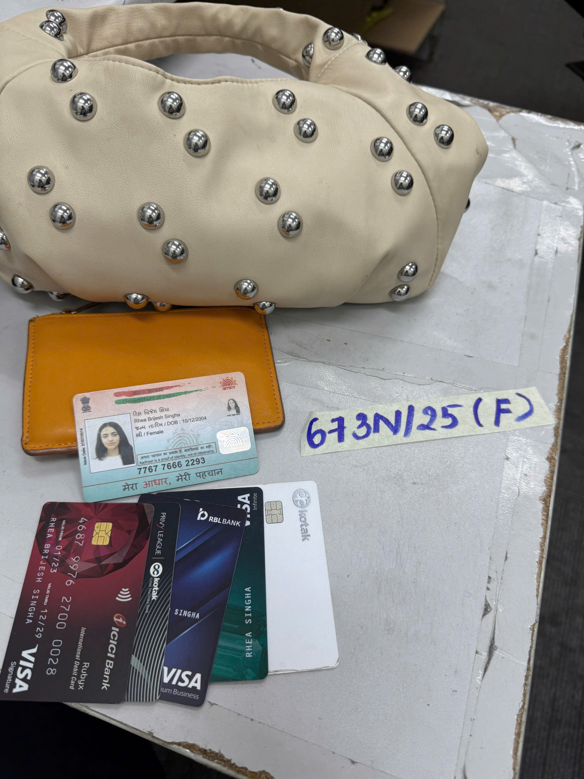 Ngày tiếp nhận: 14/4/2025 Mã hồ sơ: 673N2025F Mô tả: 01 túi vải màu da đính đinh tán, có 01 thẻ ID tên Rhea Brijesh Singha, 01 ví nữ nâu chữ Accessorize có 05 thẻ Visa tên Rhea Brijesh Singha, 01 tờ Đô la Úc mệnh giá 50 AUD và đồ cá nhân đã qua sử dụng. |
