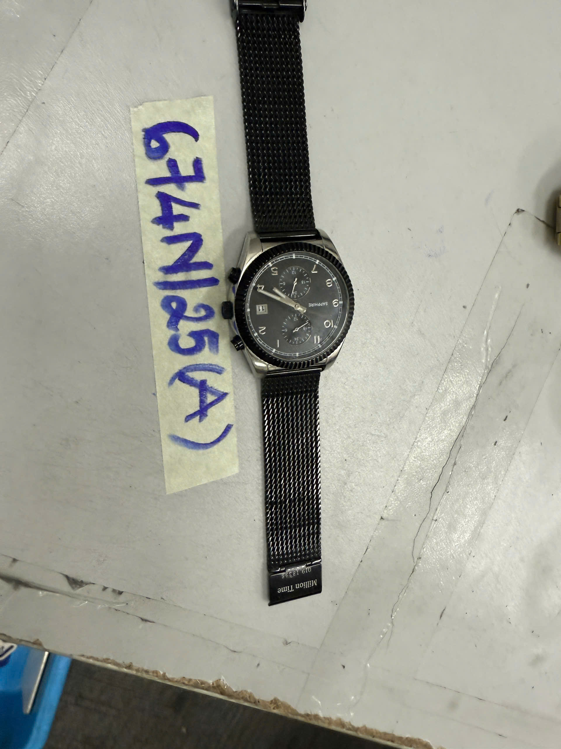 Ngày tiếp nhận: 14/4/2025 Mã hồ sơ: 674N2025A Mô tả: 01 Đồng hồ mặt tròn, dây đeo kim loại màu đen có chữ “SAPPHIRE” (đã qua sử dụng). |