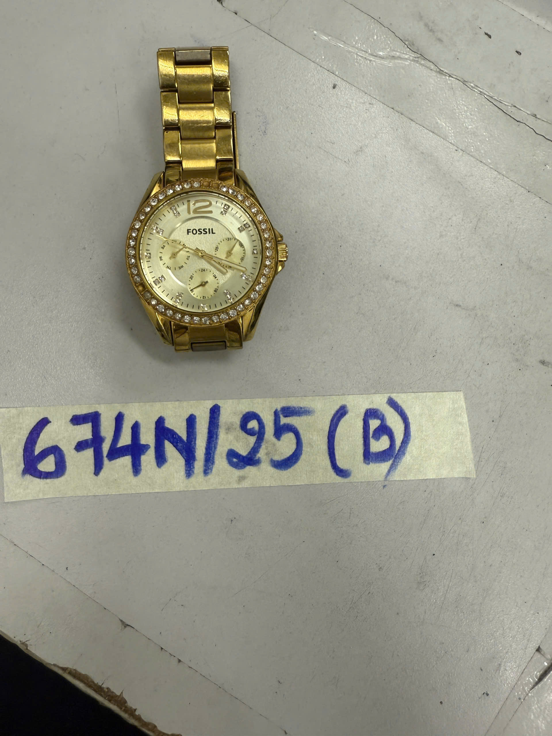 Ngày tiếp nhận: 14/4/2025 Mã hồ sơ: 674N2025B Mô tả: 01 Đồng hồ mặt tròn, dây kim loại màu vàng có chữ “FOSSIL”. |