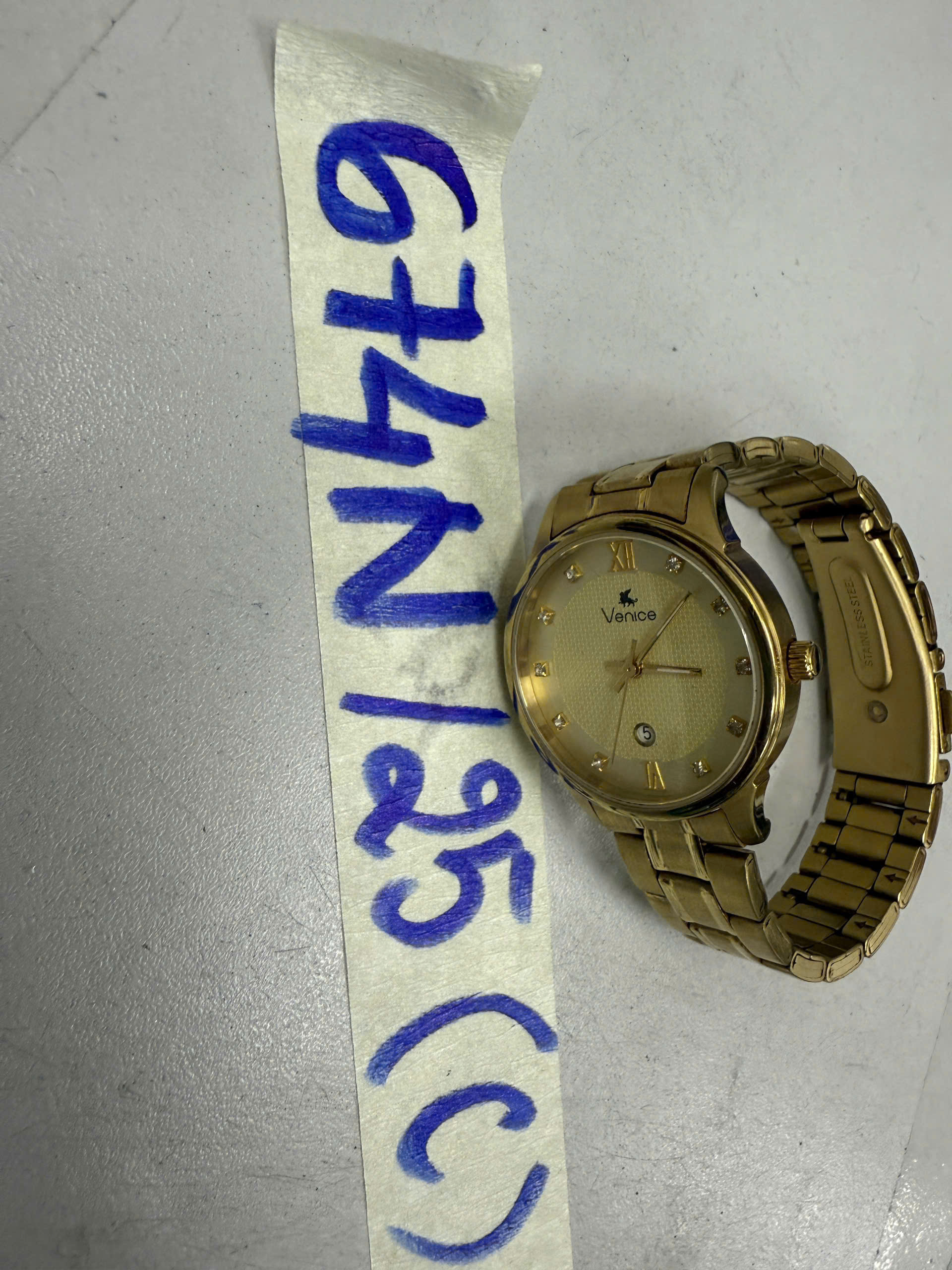 Ngày tiếp nhận: 14/4/2025 Mã hồ sơ: 674N2025C Mô tả: 01 Đồng hồ mặt tròn kim loại màu vàng có chữ “VENICE”. |
