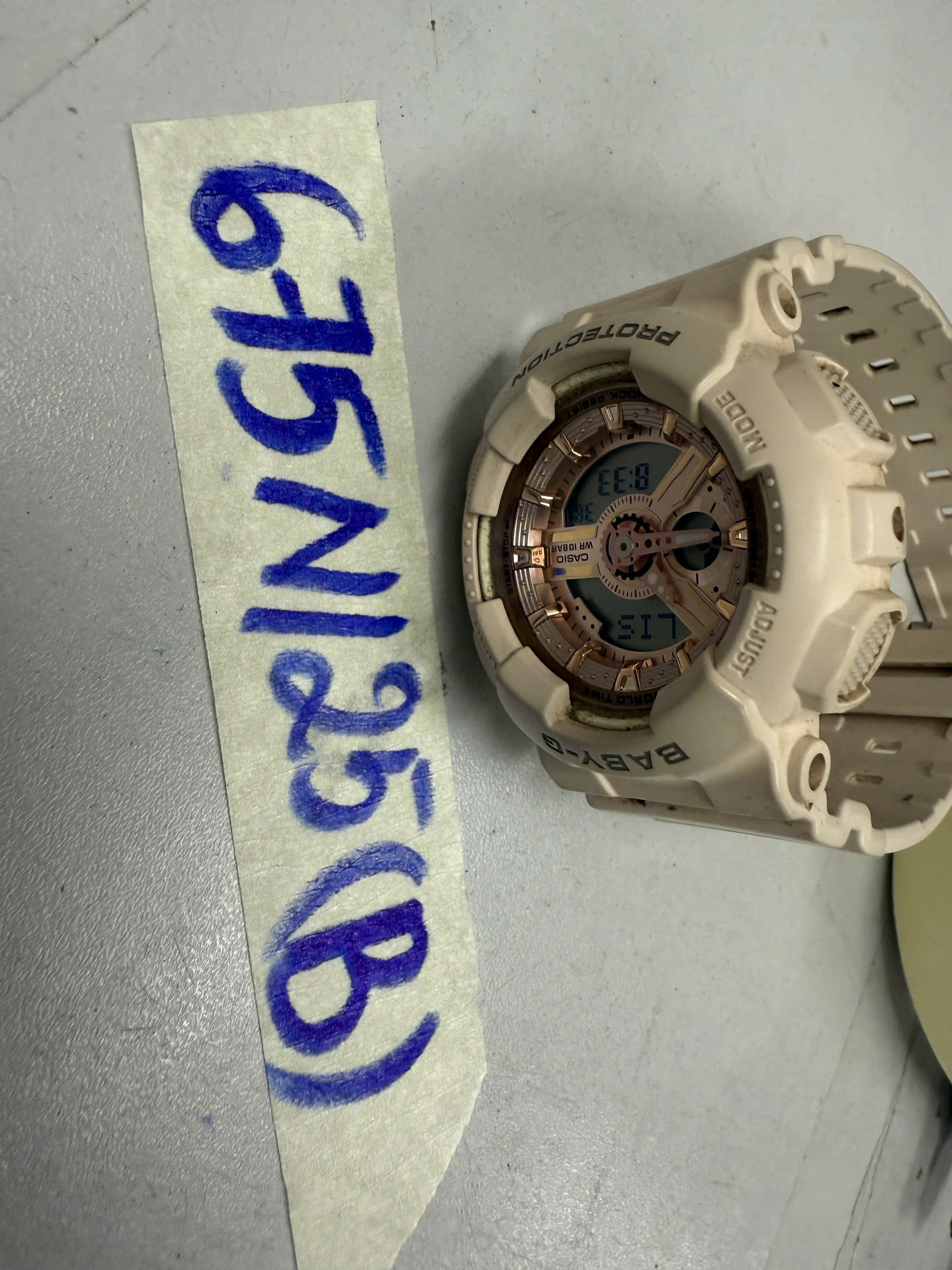 Ngày tiếp nhận: 14/4/2025 Mã hồ sơ: 675N2025B Mô tả: 01 Đồng hồ CASIO trên mặt đồng hồ có chữ “BABY-G”, dây nhựa màu trắng. |