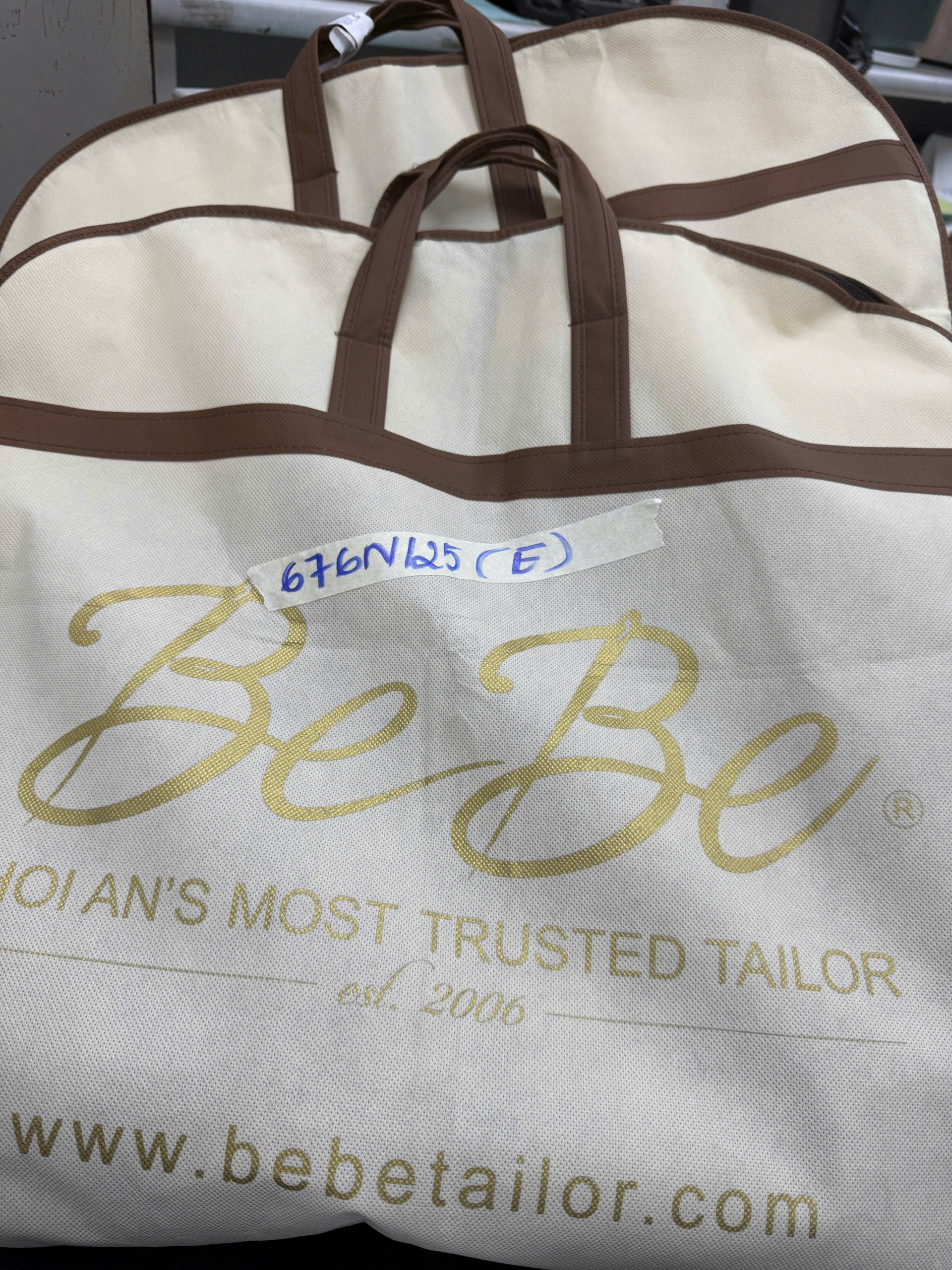 Ngày tiếp nhận: 14/4/2025 Mã hồ sơ: 676N2025E Mô tả: 01 túi vải đựng Vest màu be chữ Be Be có 02 áo vest nâu và xám. |
