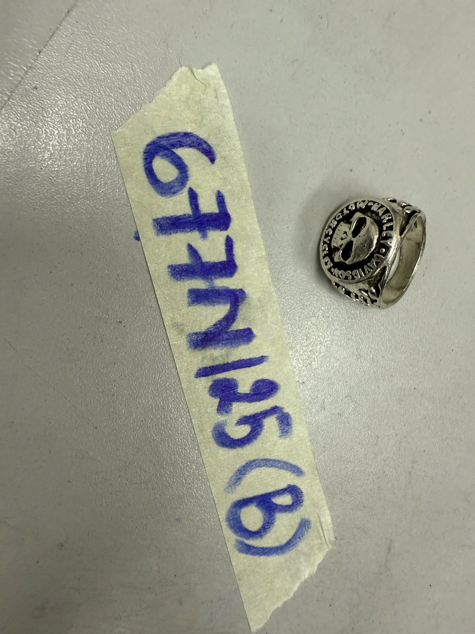 Ngày tiếp nhận: 14/4/2025 Mã hồ sơ: 677N2025B Mô tả: 01 nhẫn màu bạc, họa tiết hình đầu lâu. |