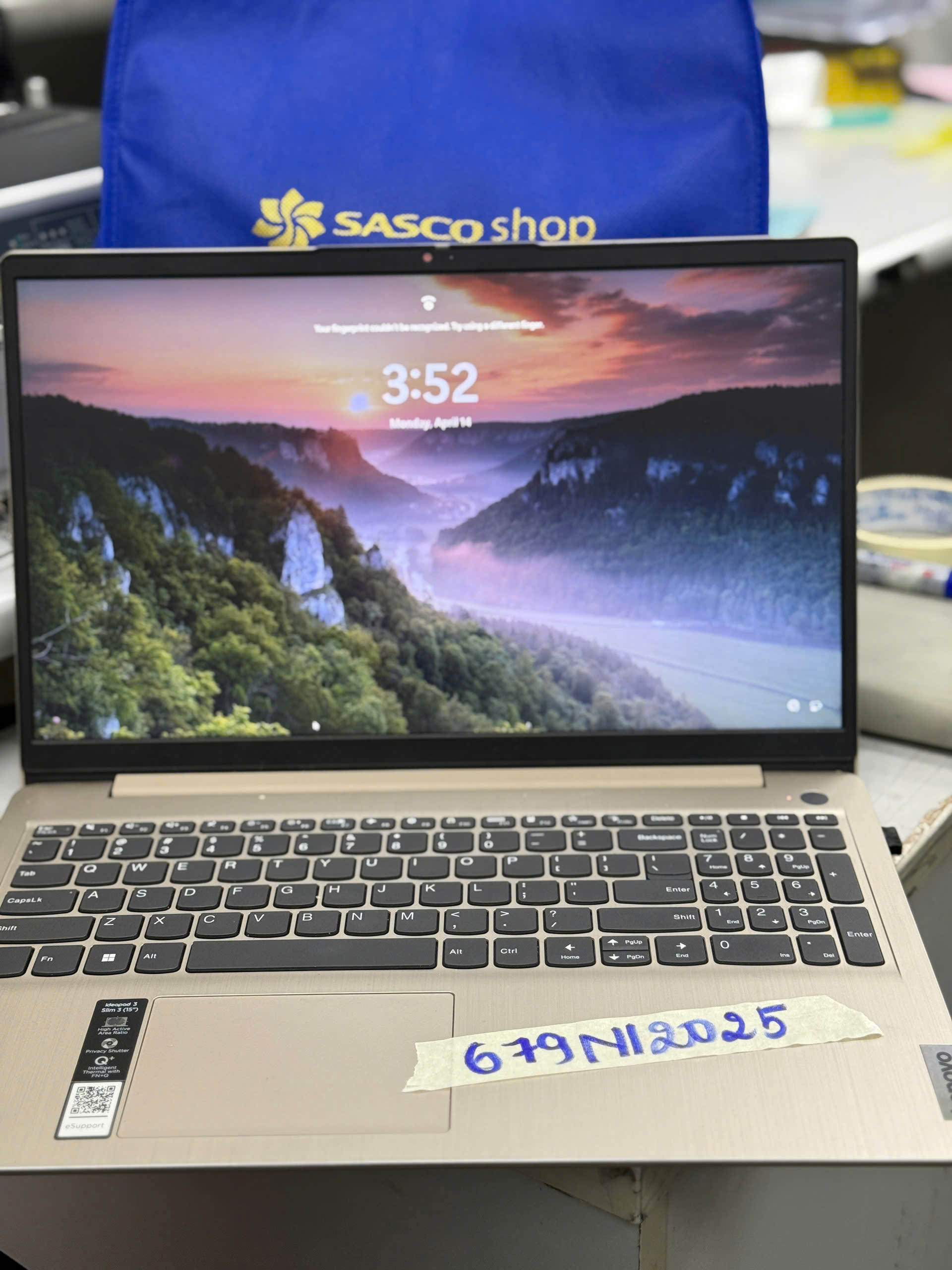 Ngày tiếp nhận: 14/4/2025 Mã hồ sơ: 679N2025 Mô tả: 01 túi màu xanh có 01 laptop Lenovo và sạc. |